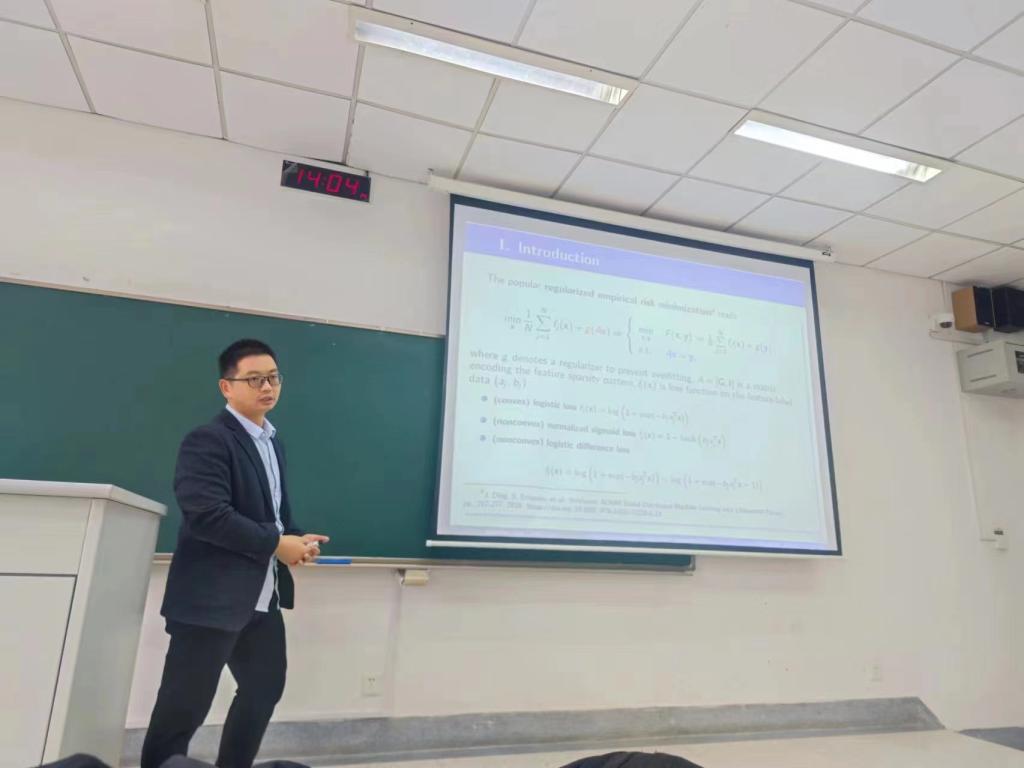 白建超副教授首先介绍了交替方向乘子法和Peaceman-Rachford分裂算法等一阶算法的基本概念,及其在神经网络、机器学习等领域中的应用。白建超副教授指出,随着实际问题规模的飞速增长,传统一阶算法变得越来越难以应对,因而引入随机策略改善一阶算法的计算效率变得非常必要。白建超副教授介绍了多种随机一阶算法及收敛性证明,并给出了设计随机一阶算法的基本思路。最后白建超副教授展示了新算法在CT影像重构、神经网络等大规模数据集上的计算结果。会后,白建超副教授与听众进行了深入的交流,解答了多名听众的问题。