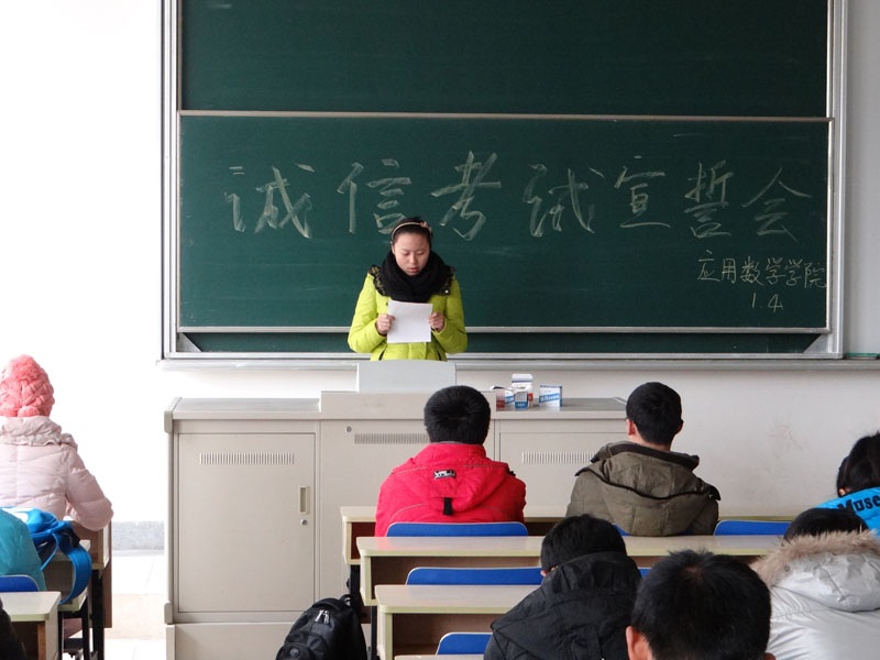 四名学生代表发完言后,由朱辰婕同学宣读学生手册上有关考试纪律与违纪的内容,谨记考试过程中公平、公正、严谨;同时通知大家有关教务处最新考试注意点。由葛琪同学宣读诚信考试倡议书,倡议有三:正确认识考试;端正态度,认真复习,积极备考;严守考纪,诚信应考。龚莉红老师用三个小故事,对即将参加期末考试的学生们投以鼓励与期盼,希望大家能很好的面对考试,诚信考试。