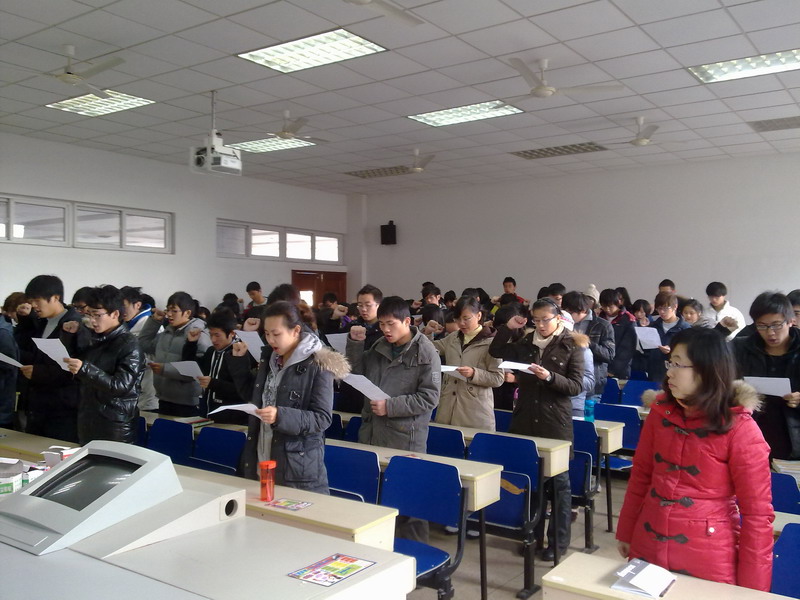 大会在一则新闻中拉开帷幕,这则新闻是06年《江南时报》对陈益茂书记首创诚信宣誓大会的报道,报道指出进行诚信应考宣誓不仅仅是希望同学们在考试中不作弊,更是对同学们进行诚信教育,比起一般的空谈诚信来的更有意义。接着两个班的班长发了言,表明了他们的决心和对同学们的期望。一班长李鸣更是现身说法对同学们进行告诫。作为一个大学生,自我管理显得特别重要,“三自委员会”的主任周雪也代表所有“三自委”的成员发了言,她指出了考试的意义以及诚信应考的重要性。最后,大会在同学们庄严的宣誓中结束了。