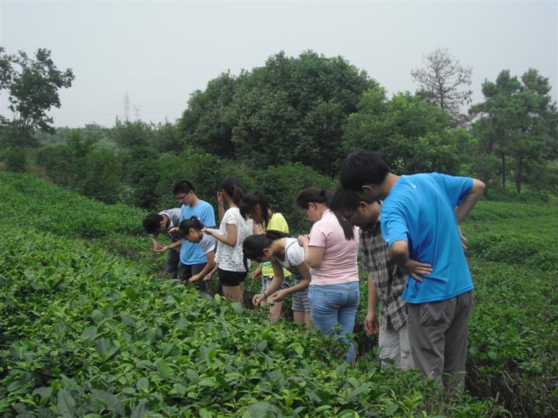 盛夏时节,茶园里烈日炎炎。怀着对采茶的好奇心,同学们走下茶田,自己来端详一下平时不多见的茶树,也小心地自己尝试着采茶。在这种切身的体会里,大家也更感受到了在阳光下辛苦采茶的农人们的艰辛。