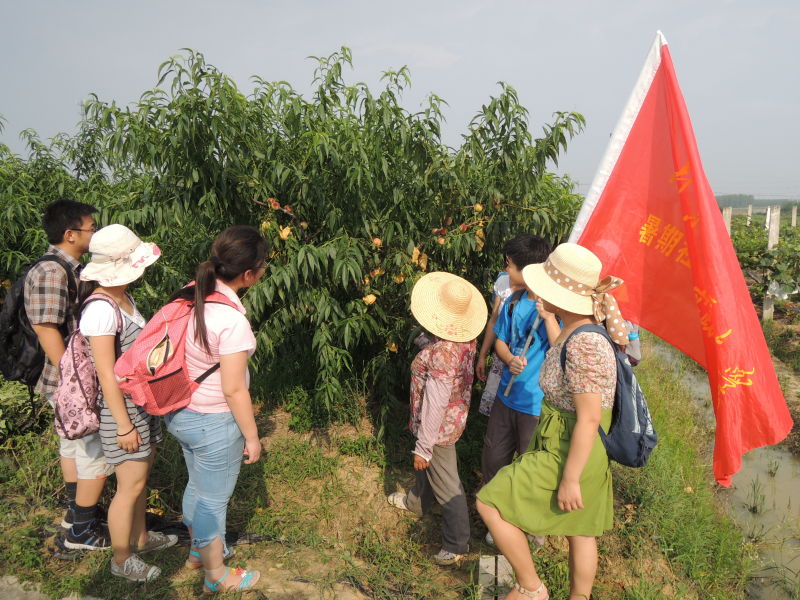 本着实事求是的态度,同学们在金坛薛埠果蔬园里认真地观察、调研。首先参观了桃园,在与工作人员的交流里,同学们了解到桃园在整个果蔬园中大约占地60亩,是整个果蔬园中占地最大的一部分,同时也为果蔬园提供了很大一部分收益。其生产的桃子是完全无公害绿色安全的,在常州、无锡一带很受欢迎。