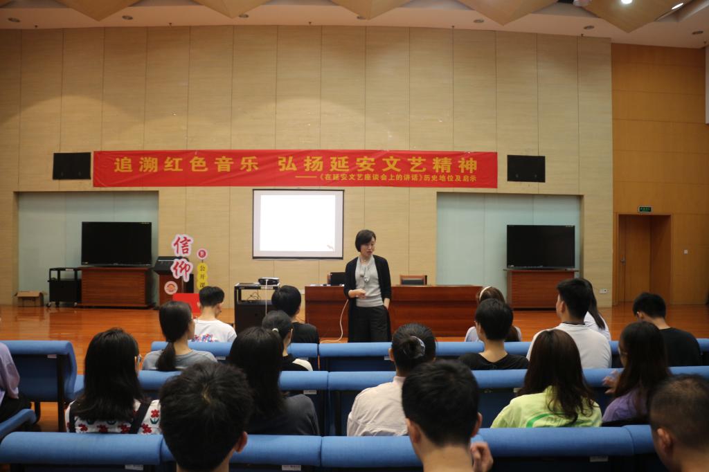 谈教授从红色音乐的内涵谈起,指出红色音乐不仅能带来感官上的享受、身心上的愉悦,更能从中汲取奋进的精神力量,具有价值引领作用。她和同学们一起重温了毛泽东主席《在延安文艺座谈会上的讲话》这篇光辉著作,再现了当时《讲话》的背景,指出毛主席阐述的文艺的本质、源泉和革命文艺为什么人等重大问题的表述指引着中国一代代文艺家创作出了丰富多彩的作品,鼓舞着中国人民创造了世界的一个个奇迹。为了让同学们更好地理解《讲话》精神,她以时间为线,介绍了红色音乐创作概况,并选取了《映山红》片段,采取情景式、沉浸式的讲解方式,通过歌曲欣赏、手势加持、小声附和、闭眼哼唱、全体合唱等教学方法,让同学们理解红歌具有反映现实生活,螺旋上升式的情感走势和体现革命必胜的坚定信念等特点,体现了文艺创作为大众服务,从现实出发,注重共鸣和共情的创作原则,发挥了战斗功能,倡议同学们在今后的学习生活中多听红色音乐,激发奋进的力量,坚定为国奋斗的理想和信念!