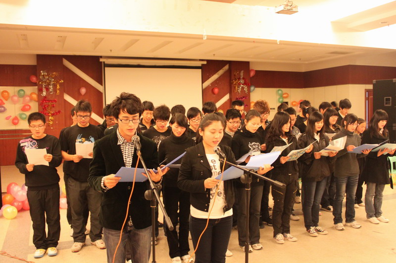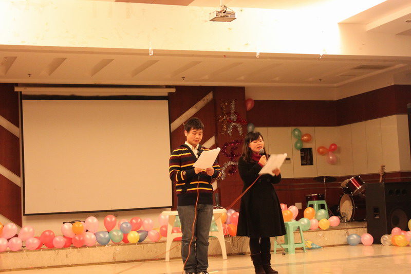 晚会伊始,“金属公社”乐队激昂的《离开地球表面》就带动起全场的气氛,随后可爱的集体舞《气球》、深情的歌曲独唱《爱的就是你》、搞怪的相声《超幸福鞋垫》,改编的话剧《梁祝外传》,互动的猜词游戏,让大家在愉快轻松地氛围中结束了第一乐章“载歌载舞贺新春欢聚一堂迎新年”。