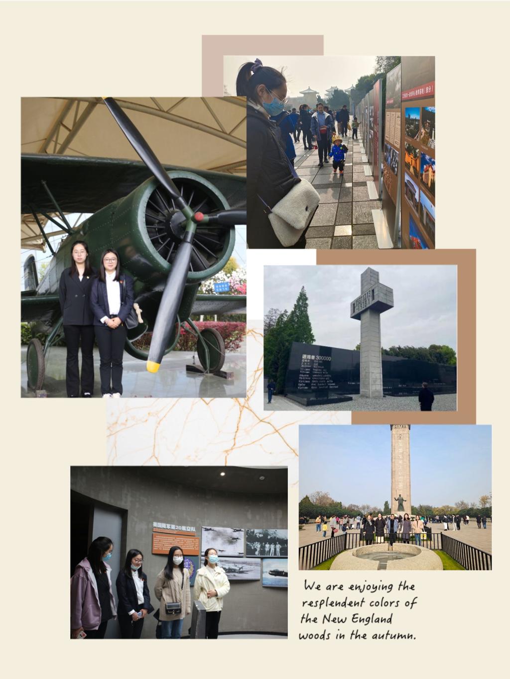 期间,同学们来到马栏村、侵华日军南京大屠杀遇难同胞纪念馆、航空烈士纪念馆和雨花台烈士陵园等红色教育基地,感受当年爱国青年为国捐躯,至死不渝的精神。吴琼同学来到马栏村,矗立村头,遥想当年,抗日先烈们为了维护民族尊严英勇就义的壮举,她不禁潸然泪下。当年革命先辈们作出的艰苦卓绝的贡献,让她深刻体会到今天的幸福生活来之不易。黄心怡同学来到了侵华日军南京大屠杀遇难同胞纪念馆。参观完后,她感叹道:在那段惨痛的历史上有数不尽为国誓死不屈而英勇就义的无名之辈,他们始终没有考虑过自身安危,一直坚定地保卫着国土和人民。 他们舍我为国的精神值得我们学习,而身为当代青年的我们必须担起时代责任,为国家而不懈努力!朱东缘、徐敏等同学来到了航空烈士纪念馆,瞻仰航空烈士们的雕像、飞机模型和飞行舱等,体会了在当时艰苦环境下航空烈士们在空中作战的壮举。当战斗机内的子弹耗尽时,自己就是最后一发子弹,以生命坚决阻挡敌人的进攻!王静怡、杨妍彬等同学来到了雨花台烈士陵园,在烈士纪念碑前,她们感受到了雨花英烈们誓死不屈的民族大义和坚定的爱国主义精神,英魂常在,此生无悔······