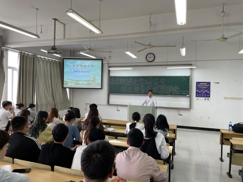 18级本科生作南京财经大学硕士研究生招生的主题讲座。首先介绍了南京财经大学的发展历史、办学特色、硕士学位授权点等基本情况,其次介绍了南财大足球比赛直播