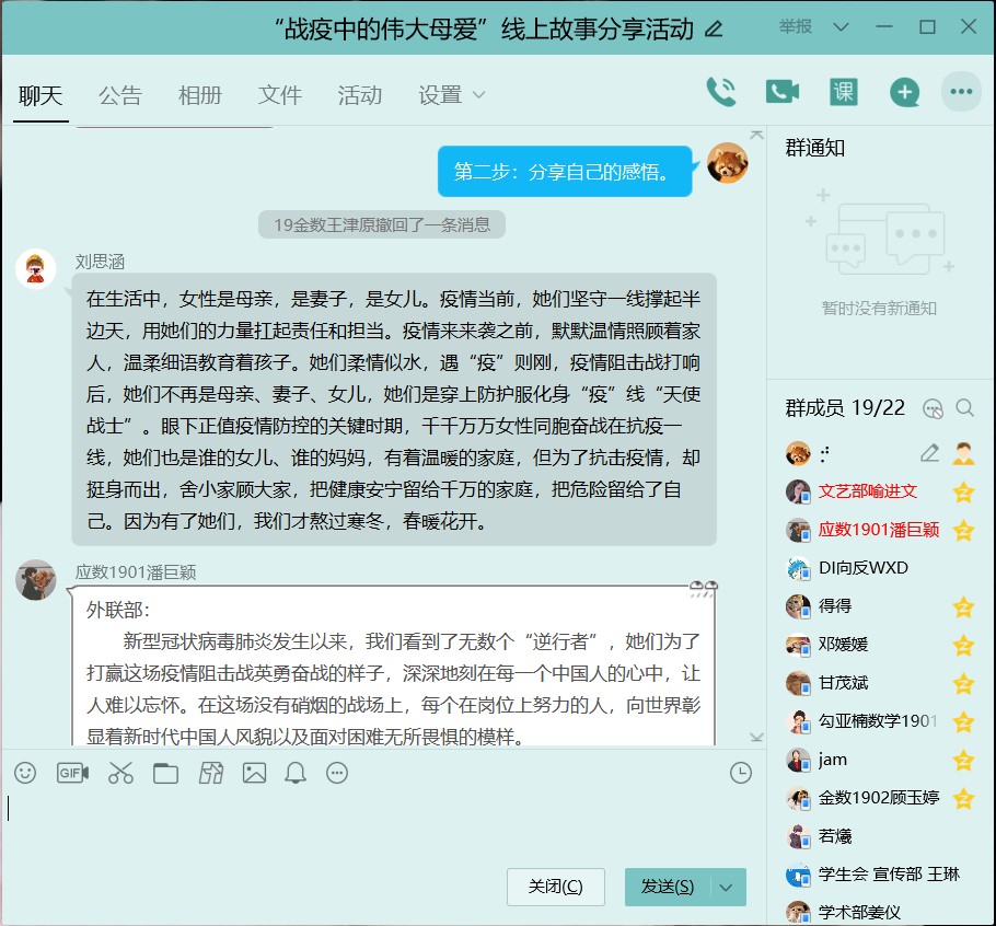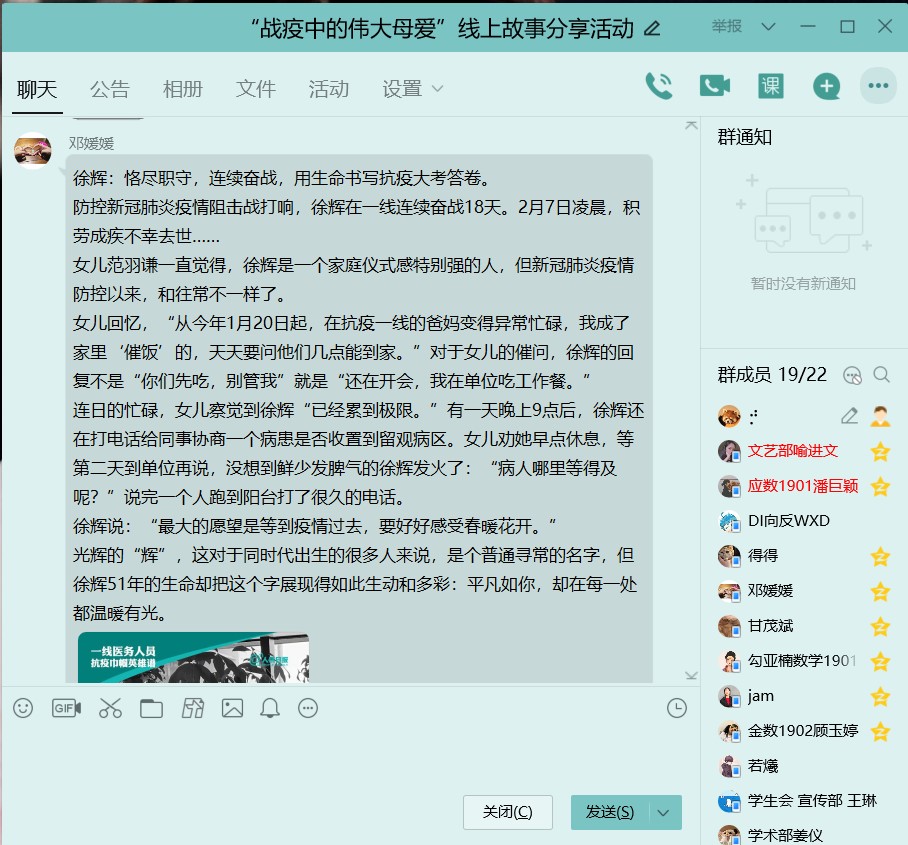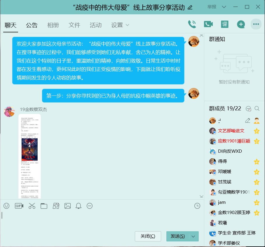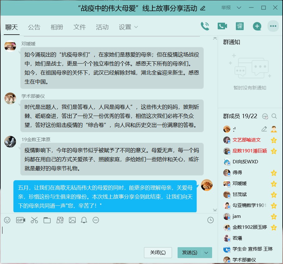 本次母亲节活动共分为两个部分,首先是分享与交流已身为人母的抗疫巾帼英雄的事迹。在疫情这场没有硝烟的战场上,发生了太多令人潸然泪下的故事:刘海燕在隔离工作十几天后,只能远远地看着哭泣的女儿,强忍眼泪:“妈妈在这儿打怪兽呢”;徐辉在一线连续奋战18天,不顾女儿的劝说,恪尽职守奔赴战场,但积劳成疾不幸去世;韦敏在病毒爆发初期就作为防城港市第一批驰援湖北的医疗队一员前往湖北,抗疫半个月后收到女儿的信,还未细看,便已红了眼眶……接下来,同学们在线上分享了自己的感悟。同学们体会到母爱的柔弱且刚强,绵薄却伟大,体会到母爱柔情似水,遇“疫”则刚。刘思涵同学感慨:“眼下正值疫情防控的关键时期,千千万万女性同胞奋战在抗疫一线,她们也是谁的女儿、谁的妈妈,有着温暖的家庭,但为了抗击疫情,却挺身而出,舍小家顾大家,把健康安宁留给千万的家庭,把危险留给了自己。”