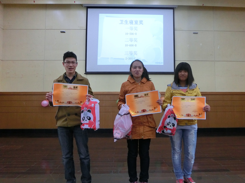 本次数学文化节由三个主要活动构成:卫生小寝评比活动、个性大寝评比活动、宿舍舍歌比赛。比赛旨在丰富校园生活、美化生活环境。参赛的10个寝室各展所长,主题斑斓有致。有的追求自然,有的个性张扬。令观众目不暇接,连连拍手称赞。上台介绍的寝室代表大多声情并茂,又各具特色,纷呈多彩,博得观众一致好评。在宿舍舍歌比赛中,大一新生以大寝为单位表演舍歌歌唱比赛,形式歌舞、内容不限,尽量有特色,积极向上。比赛还邀请到了宿管阿姨前来参加。节目由各位评委进行打分,评出一等奖、二等奖、三等奖,现场公布并进行颁奖。
