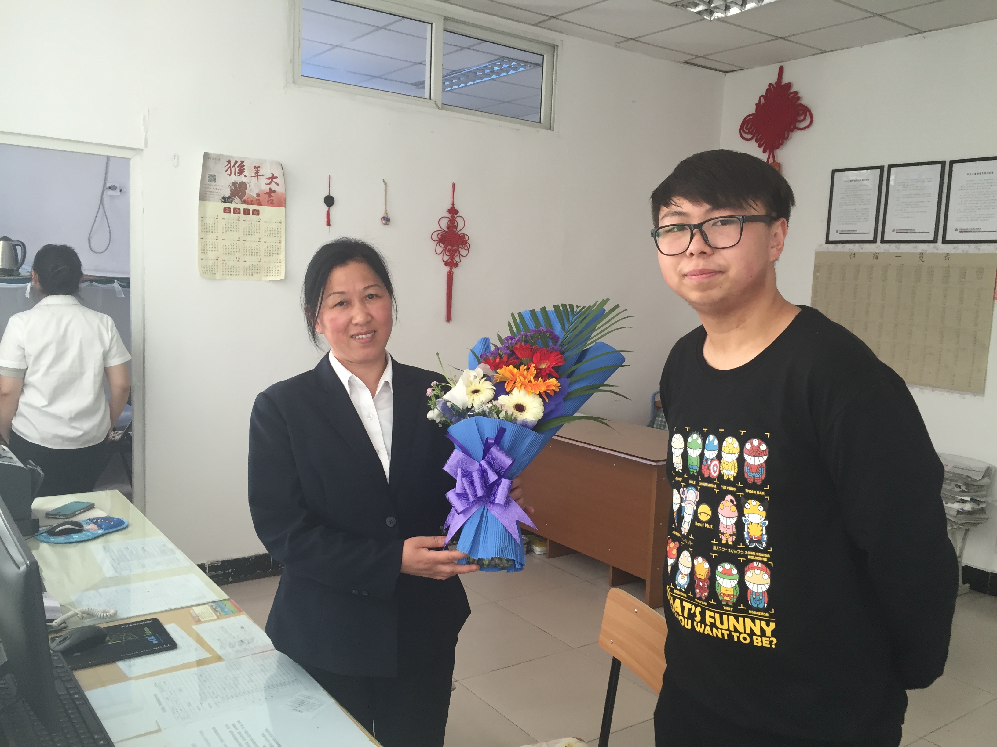 同学们在宿管站进行义务劳动,擦洗玻璃、清扫地面、捡拾固体垃圾。在劳动的过程中,同学们热情饱满、积极努力,展现出了朝气蓬勃、精神抖擞的良好状态。劳动过后,在窗明几净的宿管站,同学们手捧鲜花,向在节日期间和工作在一线的宿管阿姨送上五一劳动节的祝福,感谢她们平日里为宿舍管理做出的无私奉献,祝愿她们工作顺利、身体健康。随后,足球比赛直播