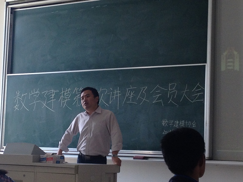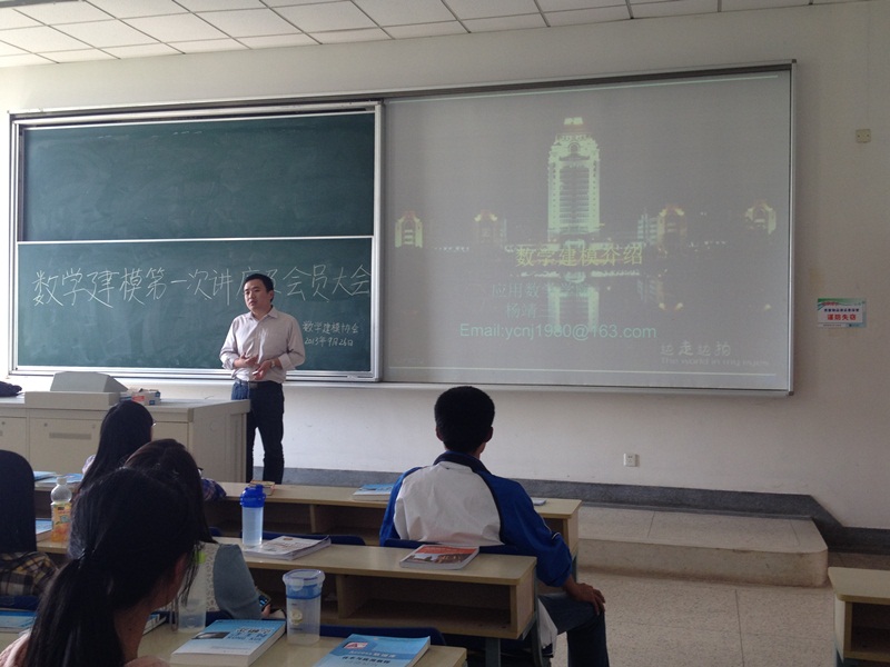 在主持人宣布讲座开始后,杨靖三老师采用PPT和板书相结合的方式为我们上了一堂生动的数模课。首先由数学的三个特性引出了本次讲座的主题——什么是数学建模;其次以交通问题和航行问题为例介绍了常用的数学模型,以及数学建模在生活各个领域的应用;再次介绍了数学建模中常用的两个方法——机理分析和测试分析,及建模的基本步骤——模型准备、模型假设、模型构成、求解、分析、检验和应用;此外,还有建模中需要的软件——Matlab、Lingo、Spss等;最后杨老师介绍了怎么学习数模和参与数学建模比赛的过程。