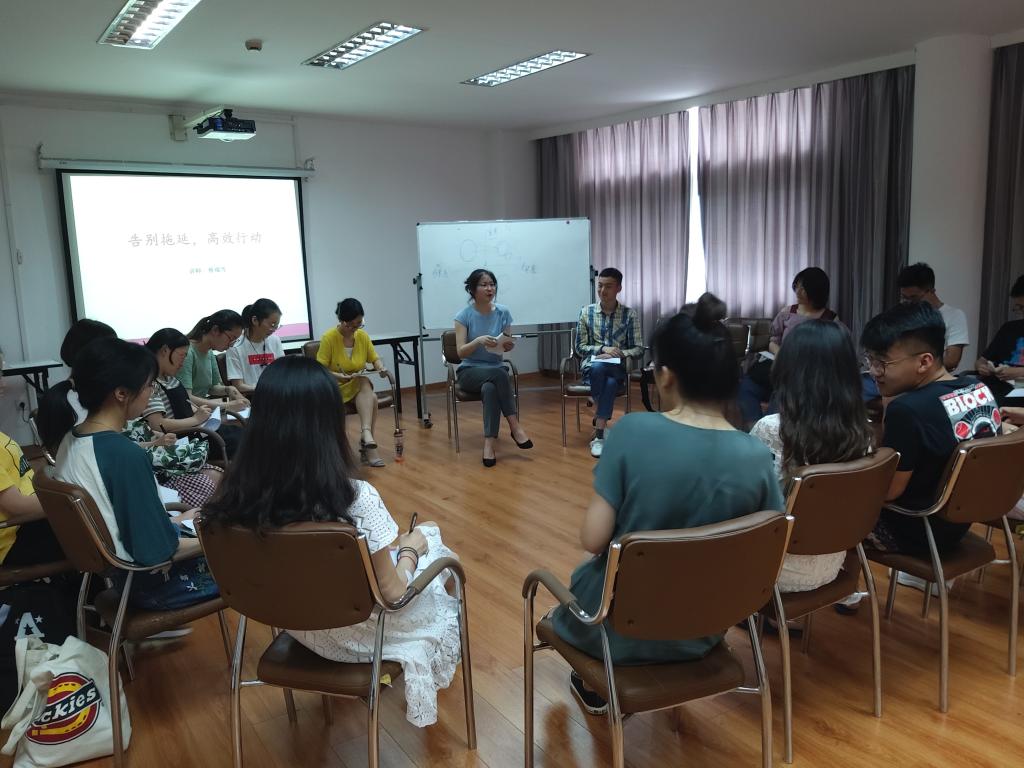 活动中,蔡瑞雪老师首先带领同学们填了一份拖延行为问卷,分数越高代表拖延越严重,通过问卷分析的方法,让同学们了解自己的拖延情况。随后,蔡老师和同学们讨论了拖延在日常学习生活中的表现,引导同学们反思自己的拖延原因,指出“拖延症”的可能成因包括压力、外部刺激、侥幸心理、自身动机、兴趣所在、突发事件等。紧接着,蔡老师提出了一些战胜拖延的解决方法,由外在动机转为内在动机、多夸夸自己努力的过程、放下手机提升专注度、用正念方法让自己多关注此时此地等。蔡老师表示,她希望大家能够从改变自己的拖延行为开始,从而改变自己的性格,最终达到改变命运的目标。