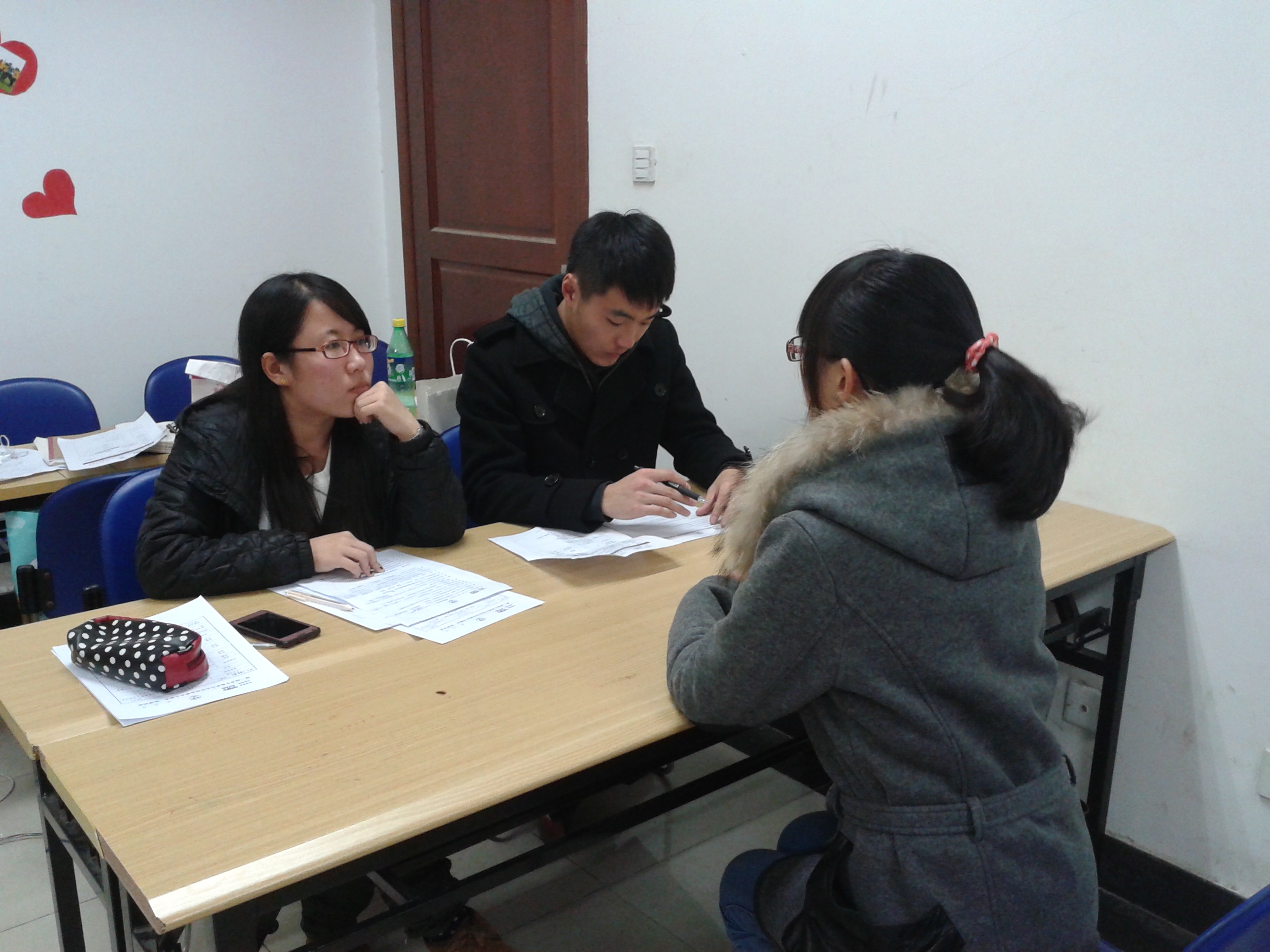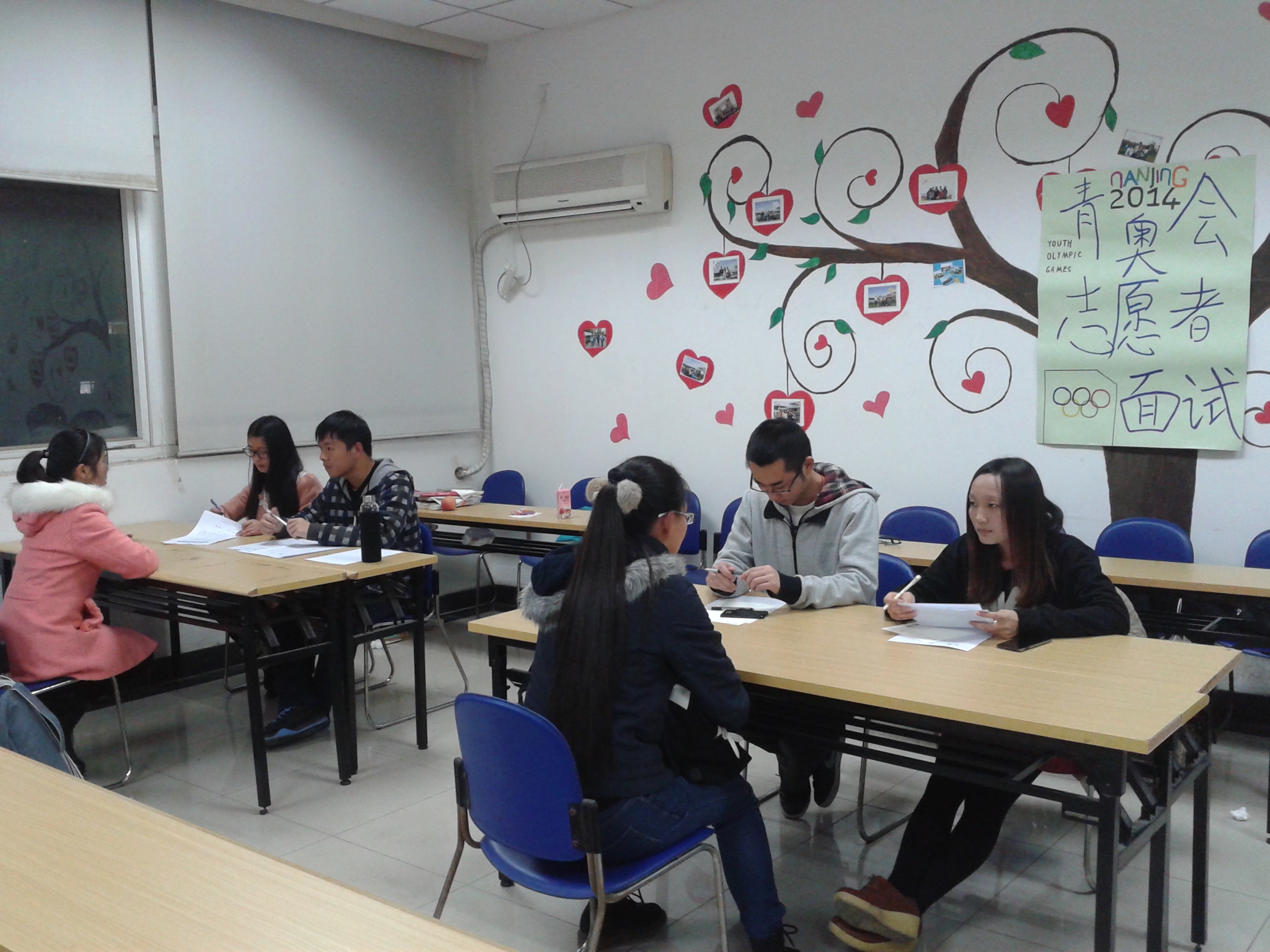 活动前一个礼拜,青志部的成员就开始忙碌起来,统计大一报名青奥会志愿者的人数、写策划。显然,我们写策划的水平有待提高,但我们会继续学习,继续努力的。面试开始前几天,我们向报名的同学们做最后的确认,提醒。周三下午5:30面试正式开始,三组面试同时进行。面试官们秉承公平公正的态度对每一个面试者进行相关问题的询问,大多数面试者准备充足,信心满满,毫不怯场,尽自己最大的努力回答相应的问题,面试秩序井然地进行。