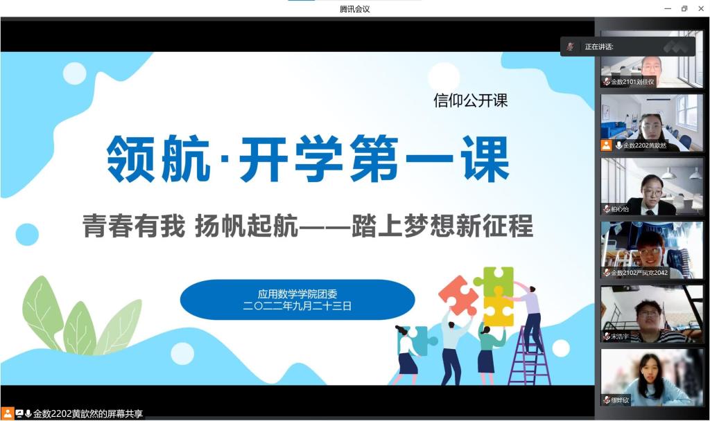 团委在云端开展了以“青春有我,扬帆起航-踏上梦想新征程”为主题的领航·开学第一课。此次公开课由院团委组织部干事黄歆然、柏心怡主持,看球直播
