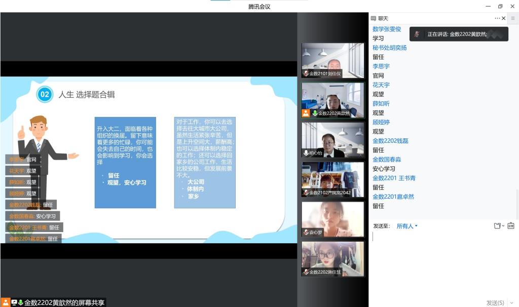 人生是选择题合辑。无论是中考时面对的文化课与直升考试,还是填报志愿时两个反复纠结的专业,人生总是一个又一个十字路口。柏心怡同学提出了大学生活中会遇到的选择并发出灵魂拷问,引发了大家对大学生活进行思考。选择并不可怕,也不需要过度纠结,了解自己的需求并对每一个选择会带来的后果进行充分预估,学会正视自己的选择,那么无论是学习还是生活都会无比精彩。