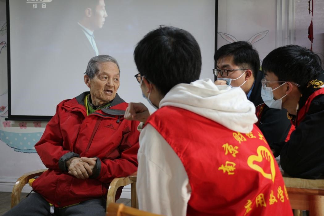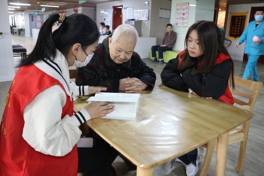 陪伴阅读:共悟书籍文化。当天下午,志愿者们的到来让平日里安静的爱馨护理院一下子热闹了起来。志愿者们为老人们带去了健康养生、历史故事、人物传记等多个方面的书籍。因为年龄的关系有的老人视力下降,有的老人识字不多,志愿者们手捧着书籍在初春午后的暖阳下,一字一句的为老人朗读书上的内容。他们有的低声慢语,有的绘声绘色,有的慷慨激昂,老人们时不时就书本中的内容与志愿者们交流。老人们丰富的人生阅历与同学们的新思想碰撞在一起,以书本为媒介,以阅读为桥梁,发生了奇妙的化学反应,让这些书籍拥有了更深刻的意蕴。