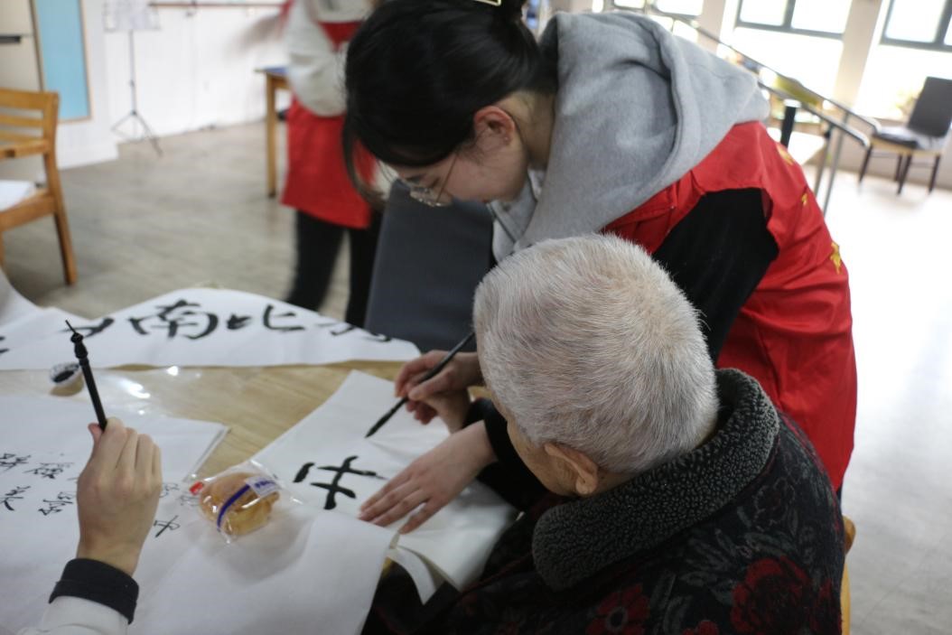 “红石榴班”的少数民族同学,他们发挥自己在传统书画上的特长,与爱馨护理院的老人们进行书画交流。国风浓厚的毛笔字让大家跨越了年龄的鸿沟,宣纸与墨汁的碰撞也拉近了同学们与老人的距离,同学们惊叹于老人们的笔法力透纸背、入木三分,老人们也热情地将经验和技法传授给同学们,大家在切磋交流中感受着毛笔的起落顿挫,享受运墨收笔、体会一撇一捺间蕴含的人生哲理。