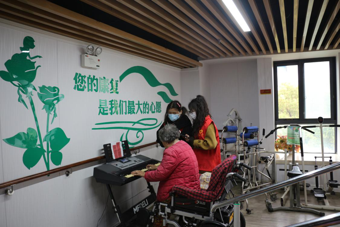 另一边的房间里传出阵阵歌声,原来是志愿者在陪伴老人们唱歌和演奏乐器,大家一起拍手,轻声附和,一曲结束便不由自主地鼓起掌来,整个护理院都被和谐融洽的氛围感染,每个人的脸上尽是轻松与愉悦,此刻仿佛已没有志愿者与老人之分,大家都沉浸在温馨快乐的氛围里。活动结束时志愿者们依依不舍地向老人们告别,叮嘱他们注意身体、适当运动,老人们也期盼着与志愿者们的下一次相遇。