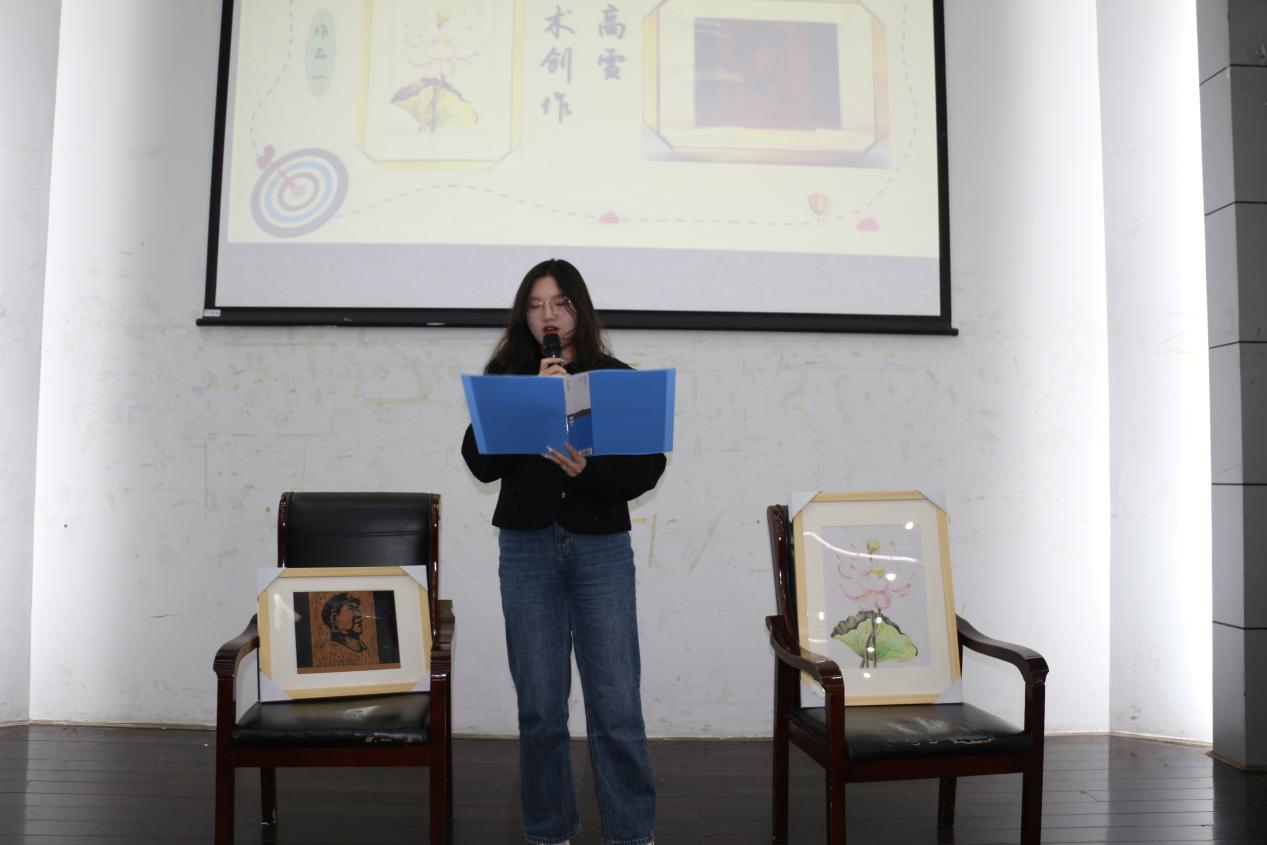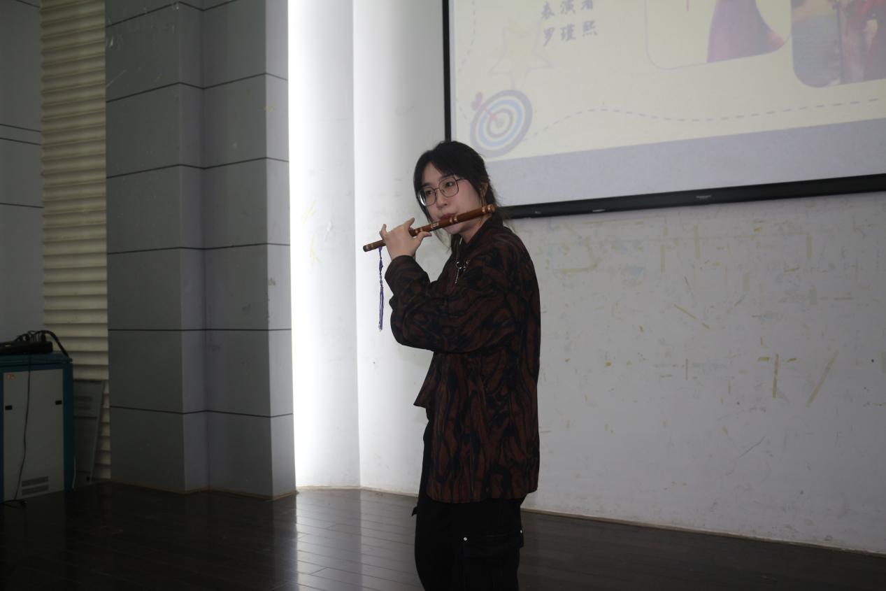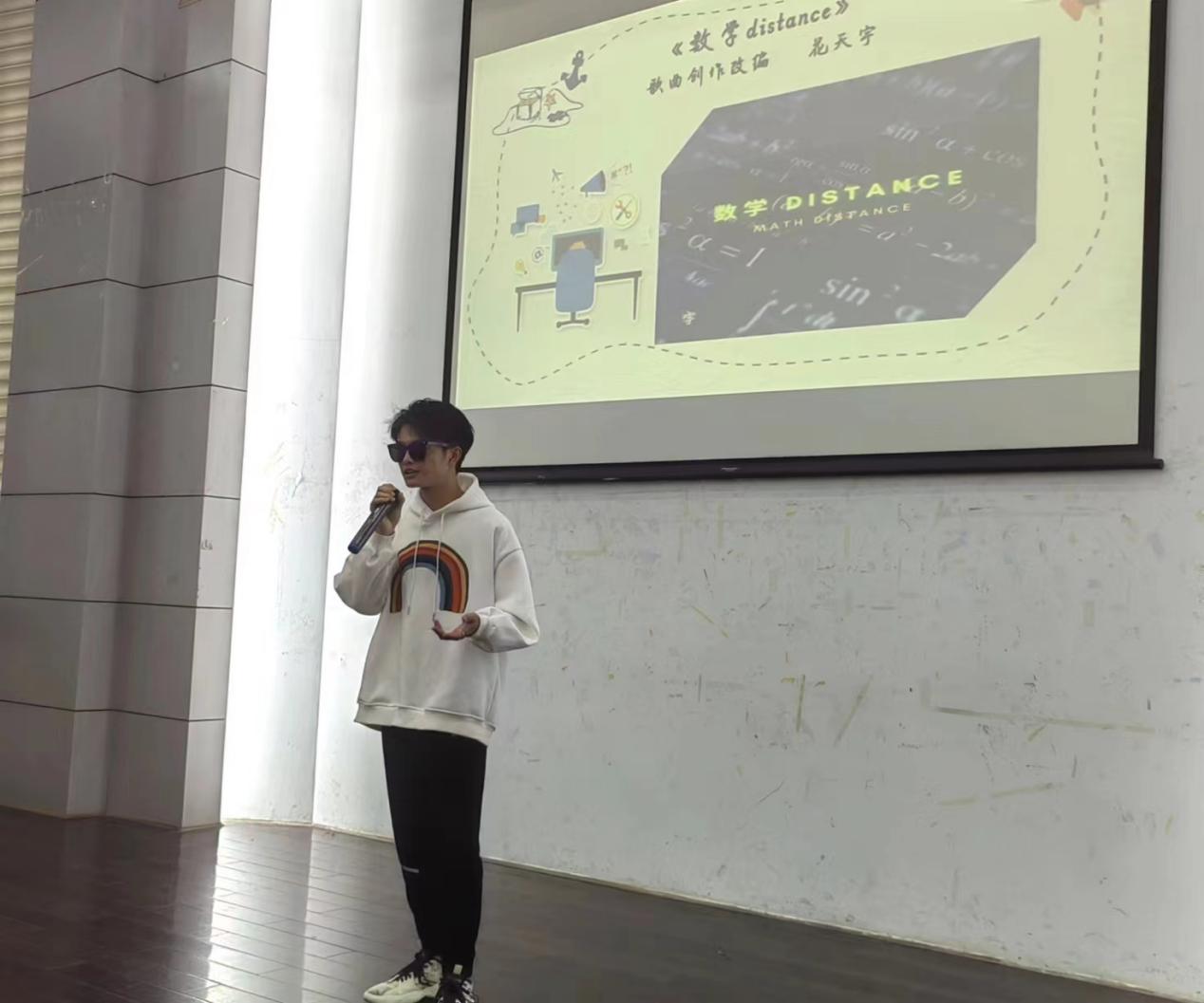 分享会由2021级同学带来的歌曲联唱拉开序幕。随后7名同学代表依次上台进行了才艺展示,并结合作品内容、表演形式、学习生活等方面的内容做了分享发言。金数2102班的罗瑾熙同学表演的长笛独奏《敕勒歌》和唢呐独奏《山里来了售货员》,赢得了现场观众的阵阵喝彩。她分享了自己学艺经历的点滴辛苦和种种收获,勉励同学们要向“五四”先辈学习,迎难而上,不断进步。金数2201班的花天宇同学演唱了自己填词的歌曲《数学distance》,贴近生活的歌词收获了阵阵掌声。他表示要学好数学,首先要端正态度,从培养兴趣爱好入手,不断激发学习动力。数学2201班赵伟钰同学结合自己的诗歌作品,带领同学们领略中华优秀传统文化的独特魅力,树立文化自信。金数2202班的高雪同学现场向同学们展示了自己的木版画和彩铅画作品。她从比例、构图等角度,结合数学原理,向同学们展现了数学的独特魅力。金数2201班朱美嘉同学和江宇森同学为大家带来了吉他合奏《铃芽之旅》,悠扬的琴声给现场同学带来了巨大的精神愉悦。金数2202的汪婷同学与同学们分享了自己设计足球比赛直播