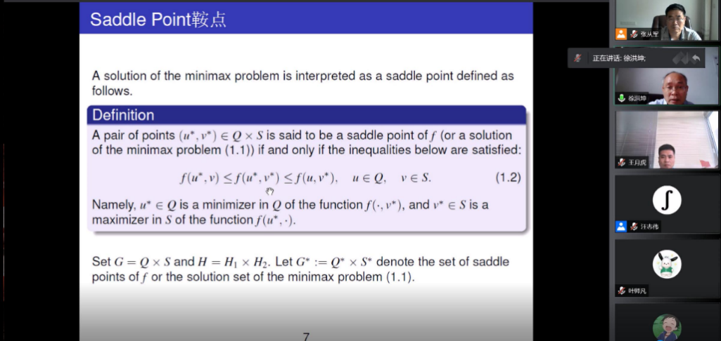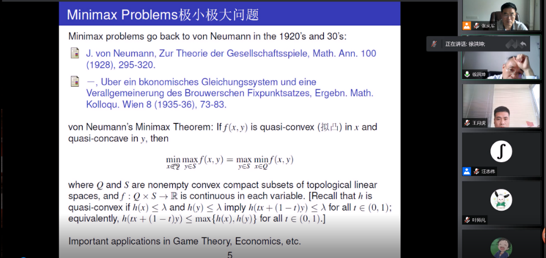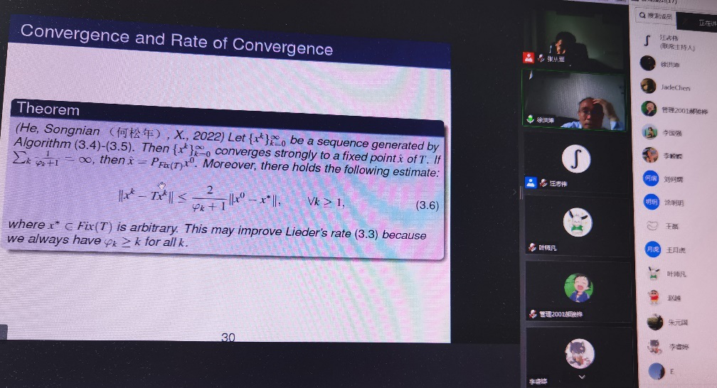 徐洪坤教授介绍了非线性分析中极小极大问题的研究背景、现状、动态和主要研究成果,非扩展映射的不动点理论和相关算法,变分不等式问题以及它们之间的相互应用。徐洪坤教授和相关学者的一些最新研究成果,特别是极小极大问题在机器学习中的应用,引起了与会者的广泛兴趣。学术报告之后,徐洪坤教授和参会人员展开了有效交流和互动,取得了良好效果。