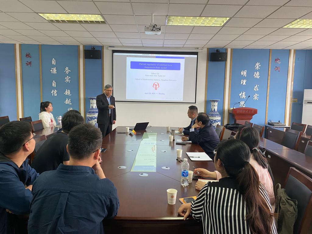 邀请,扬州大学刘祖汉教授在仙林校区德业楼508会议室作了题为“Partial regularity of the solution to a chemotaxis-fluid model”的学术讲座。讲座由看球直播