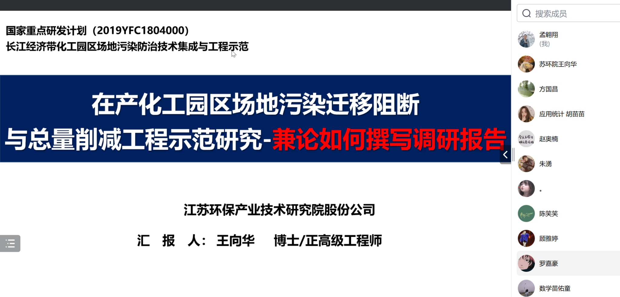 讲座伊始,王所长首先介绍了研究工作背景,分别讲述了长江经济带—生态环境大保护、我国化工园区发展历史、土壤—地下水污染特点、工程示范化工园区等方面背景。在调研方法的讲解中,王所长强调了数学在制定调研计划中的重要作用。他指出,利用数学模型可以更精准地预测调研结果,并在调研中通过数据分析确保调研的全面性和准确性。调研结束后,数理统计方法有助于形成高质量的调研报告。王所长以“垂直阻隔+原位氧化修复”的实际调研为例,向大家展示了土壤修复技术的具体应用。他详细说明了如何通过数学模拟优化修复方案,提高修复效率。在讲座的最后环节,王所长总结了示范工程的成就与创新点,并就相关领域未来的调研方向进行了展望。他表示,随着技术的不断进步,土壤修复的方法和手段将更加多元化和高效化,期待更多的科研人员投入到这一领域的探索中,助力环保事业的长足发展。