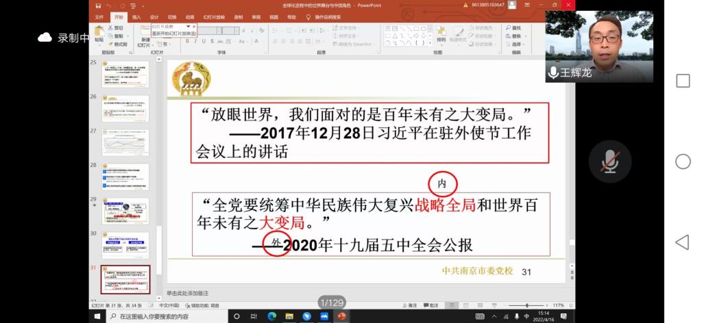 4月16日下午,南京市委党校市情研究中心主任王辉龙教授应邀于线上作了题为“全球化进程中的世界舞台与中国角色——从《共产党宣言》说起”的讲座。讲座由足球比赛直播 党总支副书记布丹丹主持,足球比赛直播 全体本科生、研究生参加了讲座。