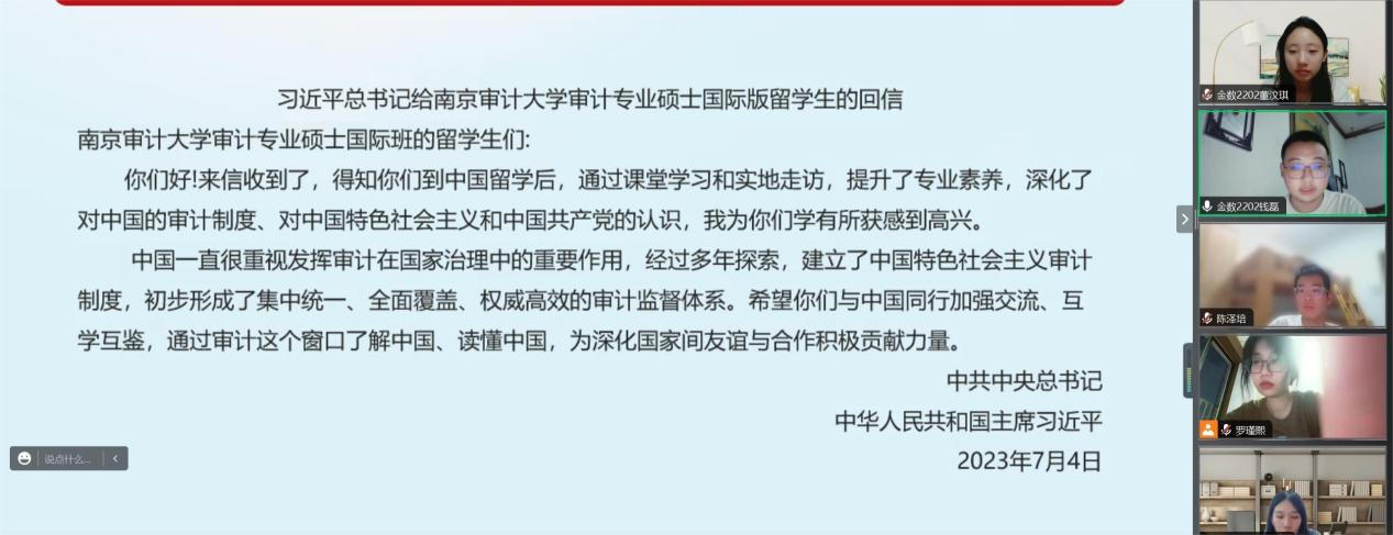 金数2102班刘翔宇:学习习近平总书记给南京审计大学审计专业硕士国际班的留学生的回信后,难以抑制激动的心情,深刻感受到习近平总书记对新时代教育对外开放工作的高度重视,对青年一代的殷切期待,这更加坚定了我以“国之所需”作为奋斗指引和矢志报国的决心。