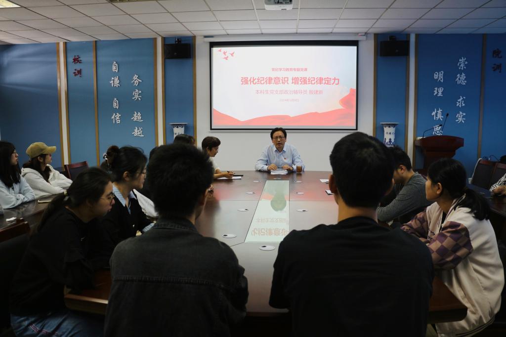 党委书记、本科生党支部政治辅导员殷建新在德业楼508会议室以“强化纪律意识 增强纪律定力”为主题讲授党纪学习教育专题党课,本科生党支部全体党员参加了党课学习。