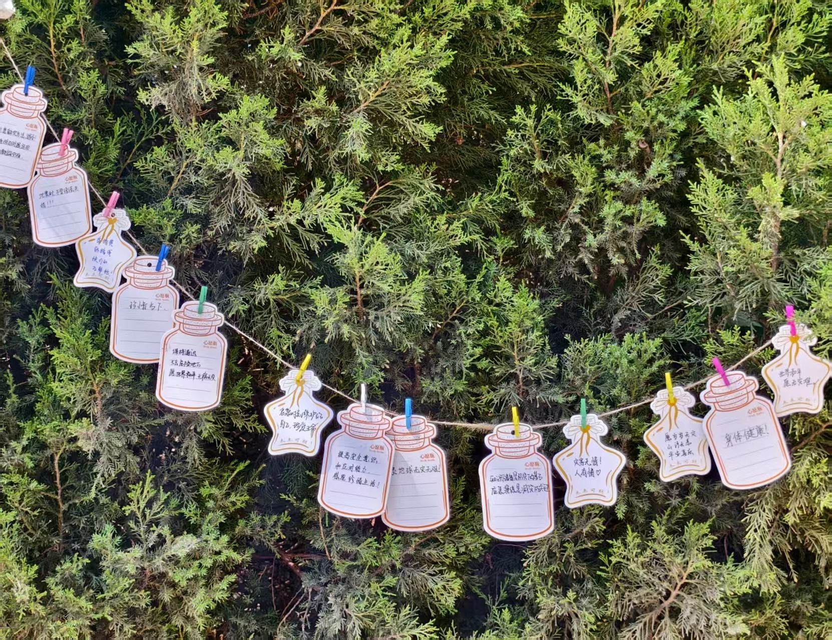 随后,活动进入创意实践环节。在“安全漂流瓶”制作与分享活动中,同学们纷纷化身“安全宣传员”:有人分享亲身经历的避险故事,以真实案例传递经验;有人发挥数学专业优势,将避险步骤凝练为简洁口诀;更有人将祝福与安全小贴士写在卡片上,制作成承载温暖与知识的“漂流瓶”。这些精心设计的“漂流瓶”状小卡片,不仅是知识的载体,更成为同学间传递关怀的纽带。活动最后,大家手举卡片合影留念,并将“漂流瓶”系于校园绿树间,让安全理念随风“漂流”,播撒校园每个角落。