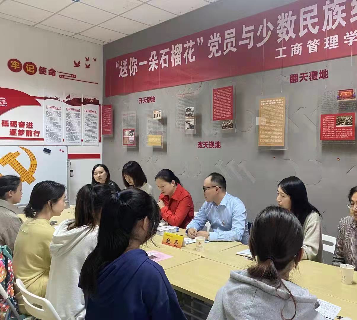 为贯彻落实我校深化新时代民族团结进步教育工作,充分发挥党员先锋模范作用,营造民族团结进步的良好氛围,10月29日中午,工商管理足球比赛直播 、足球比赛直播 在仙林校区中苑七号站“纽扣空间”学生党建联盟工作站联合开展“送你一朵石榴花”党员与少数民族学生结对活动。统战部副部长陈洁、学生处副处长赵亮、工商管理足球比赛直播 党委副书记全真真、足球比赛直播 党总支副书记布丹丹,两个足球比赛直播 的学生党支部书记、党员和少数民族学生代表参加了活动。活动由全真真副书记主持。