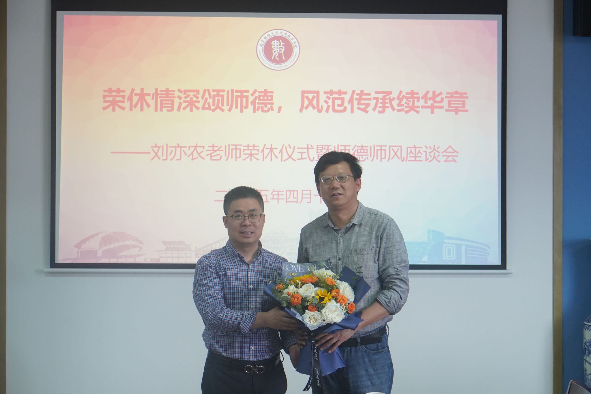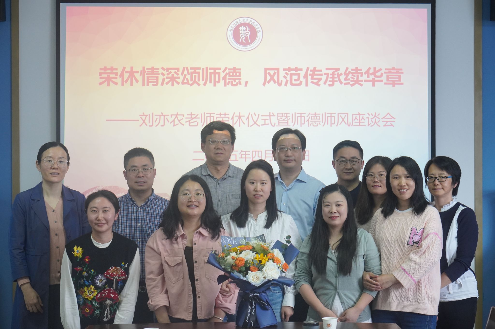 向刘亦农老师献上鲜花,表达对他的崇高敬意。全体参会老师合影留念,记录下这一珍贵时刻。