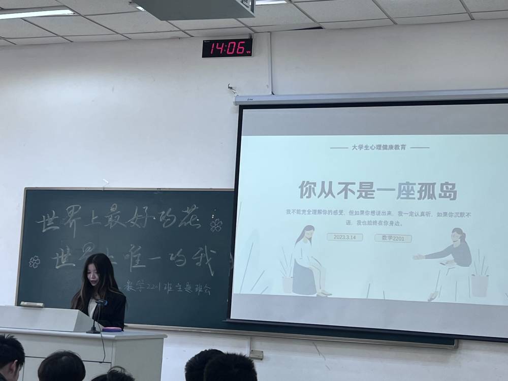 数学2201班“世界上最好的花,世界上唯一的我”主题班会以大学生心理健康为切入点,普及大学生常见的心理健康问题与矛盾的心理状况,并围绕这些问题向同学们介绍自我调适的方法。数学2101班“雷锋精神薪火传,青春志愿绽光彩”主题班会从几个关于雷锋的小故事中引出大学生传承弘扬雷锋精神的重要性并呼吁同学们向雷锋同志学习,让自己的青春绽放光彩。金数2201班“开学那点事”主题班会从开学注意事项开始,系统梳理了包括个人安全、期末考试、疫情防控等在内的开学重点工作,并为同学们合理规划时间提供建议。上述三个班级将代表足球比赛直播