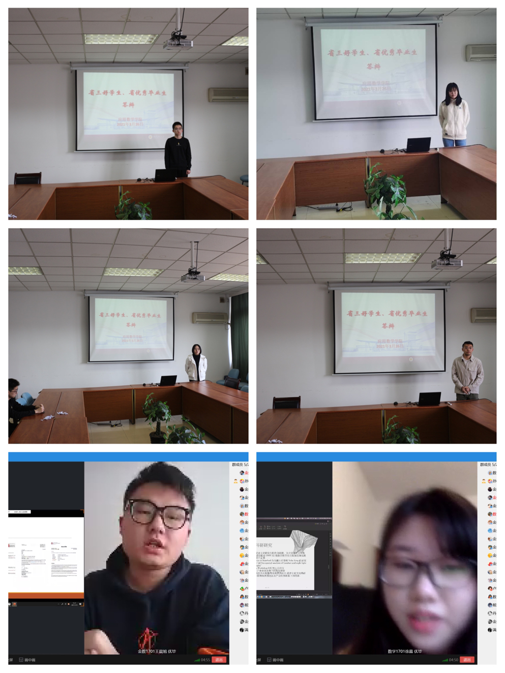 在仙林校区德业楼530会议室通过线上线下相结合的形式开展2020-2021年度“省三好,省优毕”公开考评会。来自各年级共10位优秀学子参与角逐。院党总支副书记布丹丹、分团委书记孙晓飞、本科生辅导员卢艳梅、刘文川等老师出任评委。