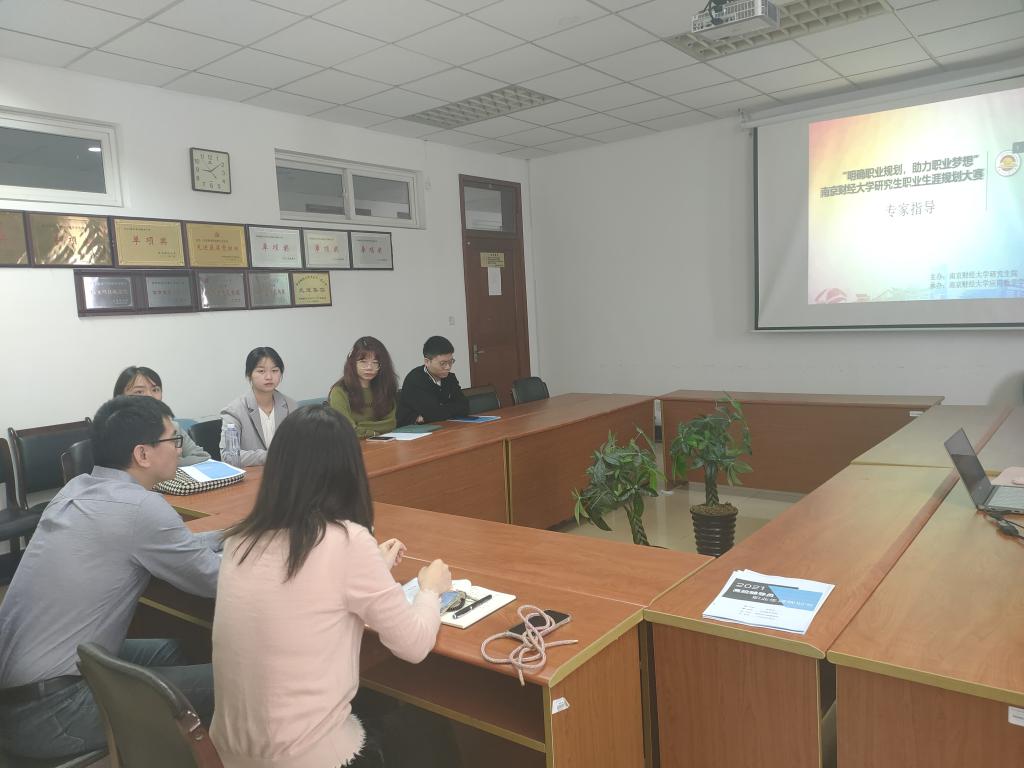 邀请,校后勤基建处副处长王成杰老师在仙林校区德业楼534室为参加研究生职业生涯规划大赛决赛的同学进行指导,会议由院党总支副书记布丹丹老师主持。
