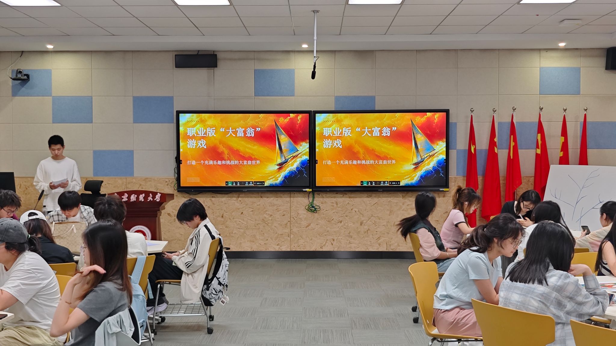 在博远楼104教室举办了“职海扬帆・青春领航”就业观教育班会。此次活动由24级辅导员李攻明主持,全体2024级学生参与。班会分为“启程—解析—交流—前行”四大板块。在“启程”环节,学生通过观看就业能力宣传片,点燃了对职业发展的探索热情;“解析”环节中,李老师深度解读就业政策,着重强调专业技能的核心作用,并组织学生以小组协作形式绘制“专业素养-就业岗位匹配图”,助力学生精准定位自身优势与职业方向;在“交流”环节,借助职业版“大富翁”游戏模拟职业规划过程中的挑战,搭配老师的专业策略剖析,进一步加深学生的理解。最后在“前行”环节,学生将就业素养提升目标书写于特制“树叶”上,共同创作“就业承诺树”,以这种富有仪式感的方式,坚定对未来职业发展的信念与决心。