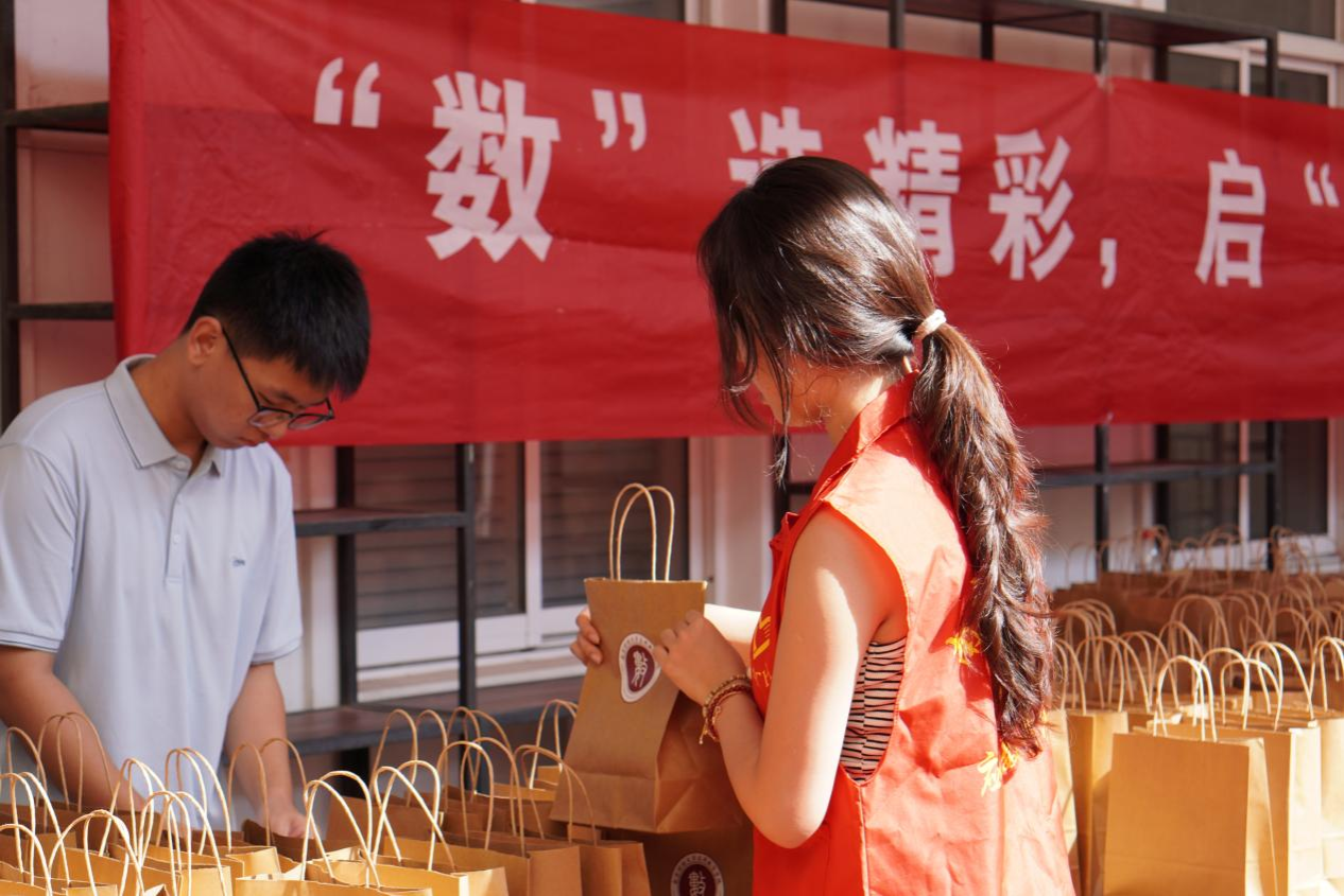 “同学,一路辛苦啦!欢迎加入数院大家庭!”“请家长放心,孩子交给我们!”……德业楼前,志愿者们手持指引牌,以热情周到的服务迎接每一位新生。楼梯口处,“数”造精彩 启“新”筑梦主题展板与缤纷气球相映成趣,由178位新生姓名组成的“欢迎新同学”字样格外醒目,成为现场最具温度的打卡点。新生们从盲盒箱中抽取写满祝福的纸条,同时收到足球比赛直播