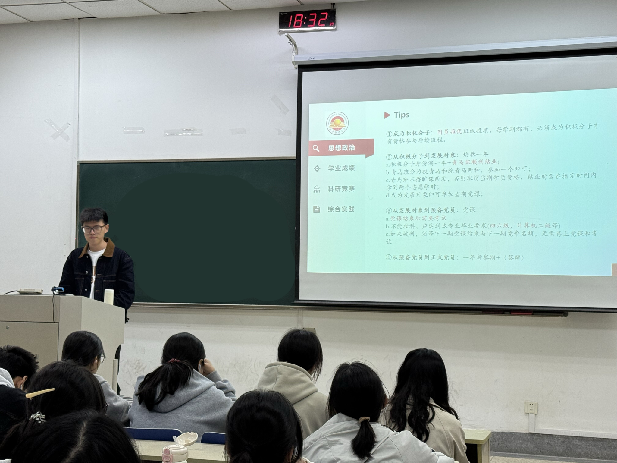 思想引领方面,中共预备党员吴文静结合其获校级“团支书思政技能大比武”二等奖的经历,阐释了思想进步对个人成长的重要意义;江宇森则系统梳理入党关键流程,提醒新生重视理论学习和组织培养,筑牢思想根基。学业规划上,吴悠建议新生科学规划英语四六级考试,深入理解奖学金评定规则,并就数学分析等难点课程,分享了“课堂抓重点、课后强练习”的有效方法;江宇森以4.31的高绩点为例,鼓励大家尽早攻克英语四级,并独创“抄书+全做课后题”学习法,助力夯实专业基础。竞赛与科研环节,多次荣获省级数学建模一等奖的吴文静详细拆解建模、编程与论文写作要点;江宇森建议从“五一数学建模”等入门赛事起步,注重团队分工;吴悠则提醒新生关注“挑战杯”等重要赛事节点,主动借助学校资源打造核心竞争力。实践锤炼方面,吴文静分享了参与“三助兴云”暑期社会实践(获评十佳团队)及超百小时志愿服务的经历;吴悠强调社会实践应形成“立项、宣传、总结”闭环,并鼓励尽早关注实习机会;江宇森结合学生会工作经历,分享了平衡学业与工作的实用经验。