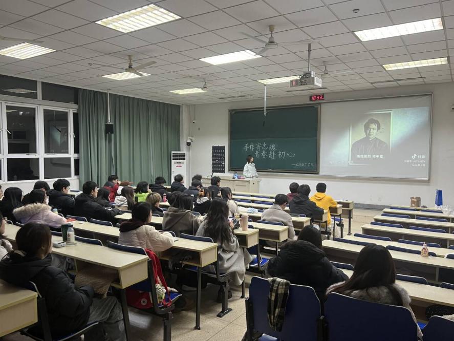 12月9日晚上,校内手工制作活动于仙林校区德业楼118教室开展。主持人介绍了活动主旨与流程后,通过播放纪录片的形式生动再现了雨花台英烈的英勇事迹。随后,主持人演示手工菊花的制作流程与核心要点。同学们分组协作,怀着对英烈的崇敬之心专注创作,将追思之情倾注于每一步操作,在庄重的氛围中完成作品,为实地敬献做好准备。