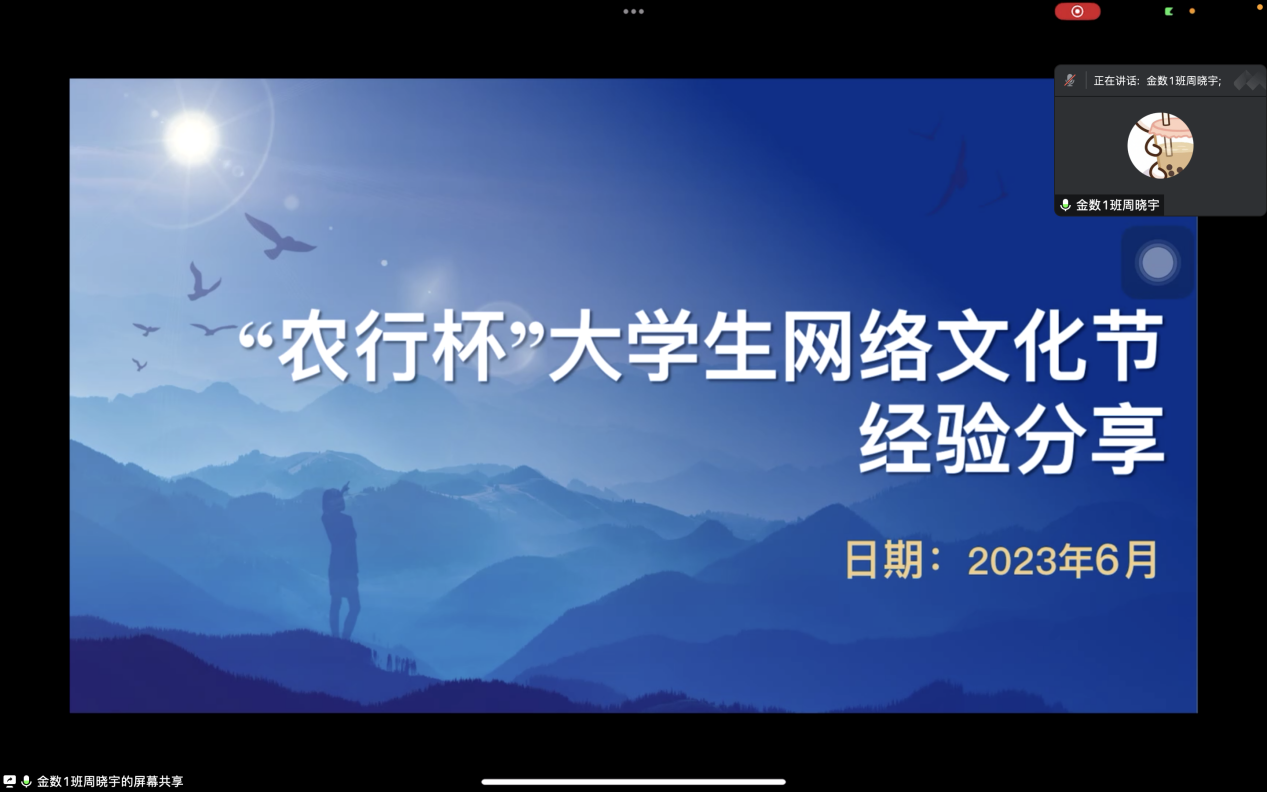 金数2001班周晓宇同学作经验分享,她结合具体参赛作品从主题选择、立意确定、素材收集、行文技巧等方面和同学们做了经验分享,鼓励同学们抓住机会,积极参与此次活动。