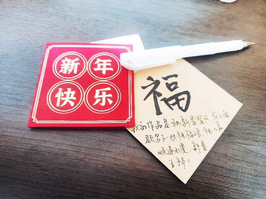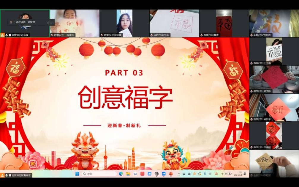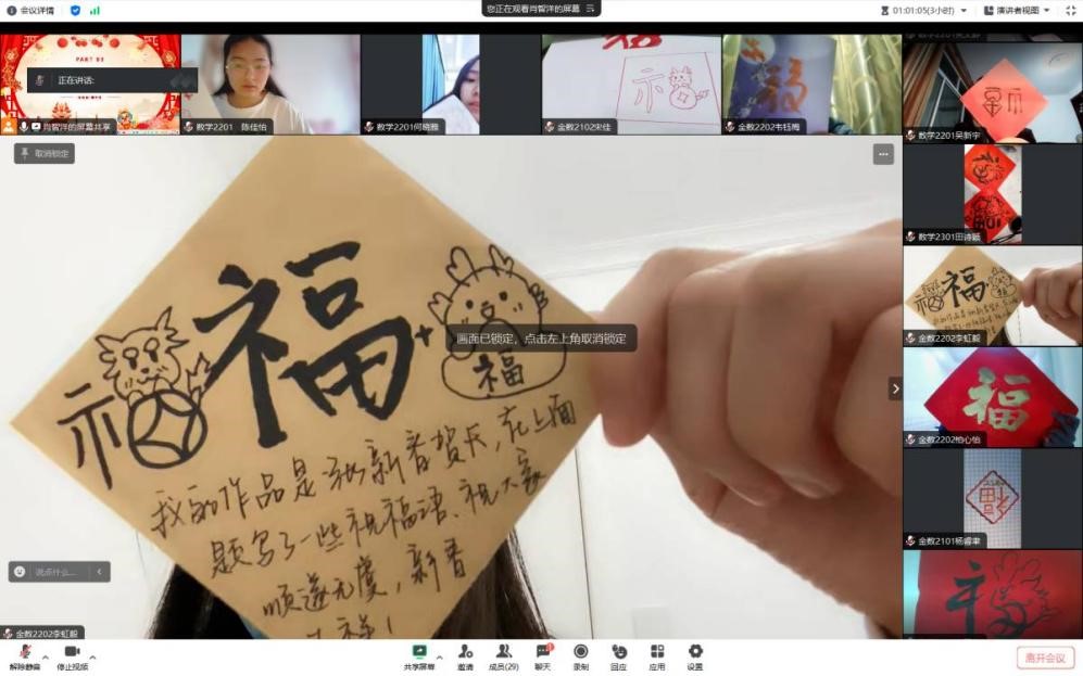 以线上会议的形式进行迎新春作品展示。同学们相聚云端,纷纷在镜头前展示自己亲手制作的创意作品。有的同学笔酣墨饱亲手书写了寓意满满的春联;有的同学发挥巧思制作了祝福满满的新年贺卡;有的同学心灵手巧裁剪了温情满满的窗花;有的同学奇思妙想设计了创意满满的福字……大家在展示作品的同时,纷纷向同学和老师送上了最诚挚的新春祝福。