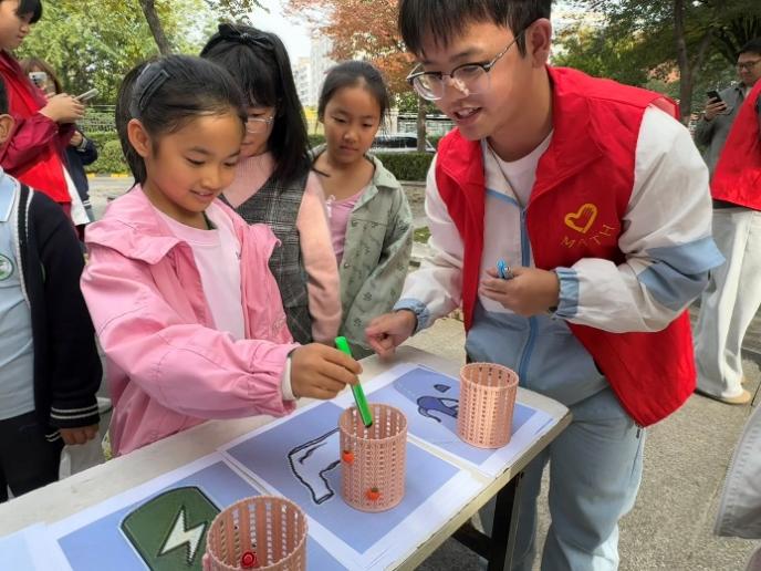 活动设置两个趣味游戏区。"环保投壶"区内,居民们凝神屏息,手中的水彩笔化作"塑料瓶""废纸张",划出的一道道弧线,不仅是游戏的比拼,更是为垃圾寻找正确归宿的环保实践。另一侧的"垃圾分类挑战"区则成了知识的竞技场。孩子们面对五花八门的垃圾卡片,或沉思、或讨论,在志愿者的引导下,将一张张卡片精准投入对应的笔筒中。在寓教于乐中"绿色、低碳、环保"的理念深入人心。