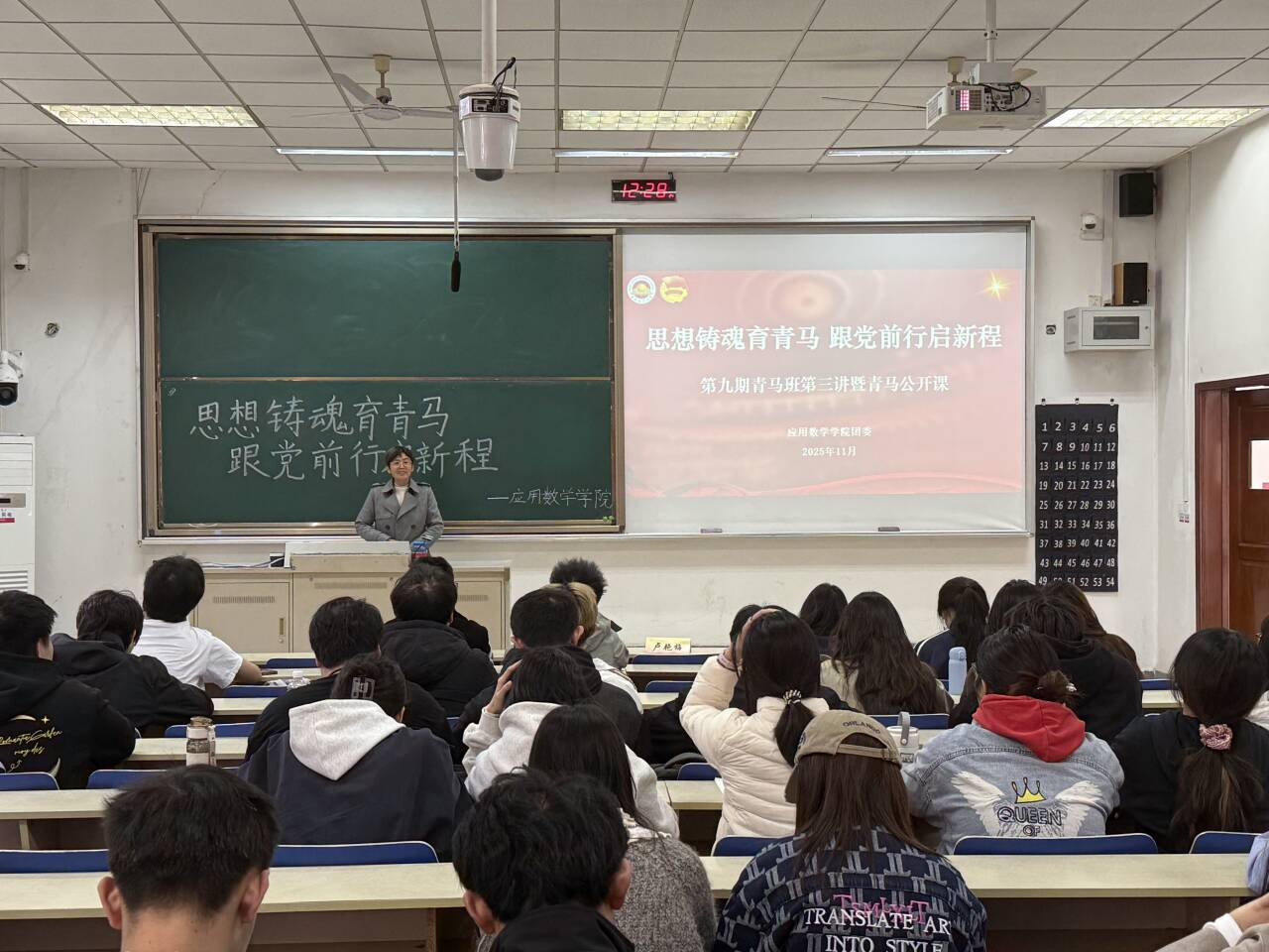 团委于11月13日中午在仙林校区德业楼101教室举办了第九期青马班第三讲暨青马公开课,本次活动以“思想铸魂育青马,跟党前行启新程”为主题,足球比赛直播