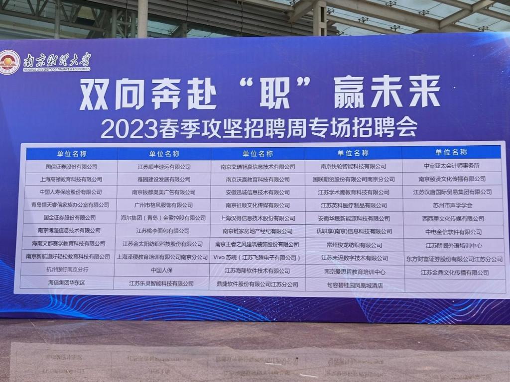 此次招聘会吸引了包括国信证券股份有限公司、海信集团华东区、杭州银行南京分行、江苏顺丰速运有限公司、南京王者之风建筑装饰股份有限公司、东方财富证券股份有限公司江苏分公司等50家企业及单位前来招贤纳才,提供的岗位涵盖了金融服务、市场营销、人力资源、软件开发、新闻传媒、房产地产、教育培训等多个行业。