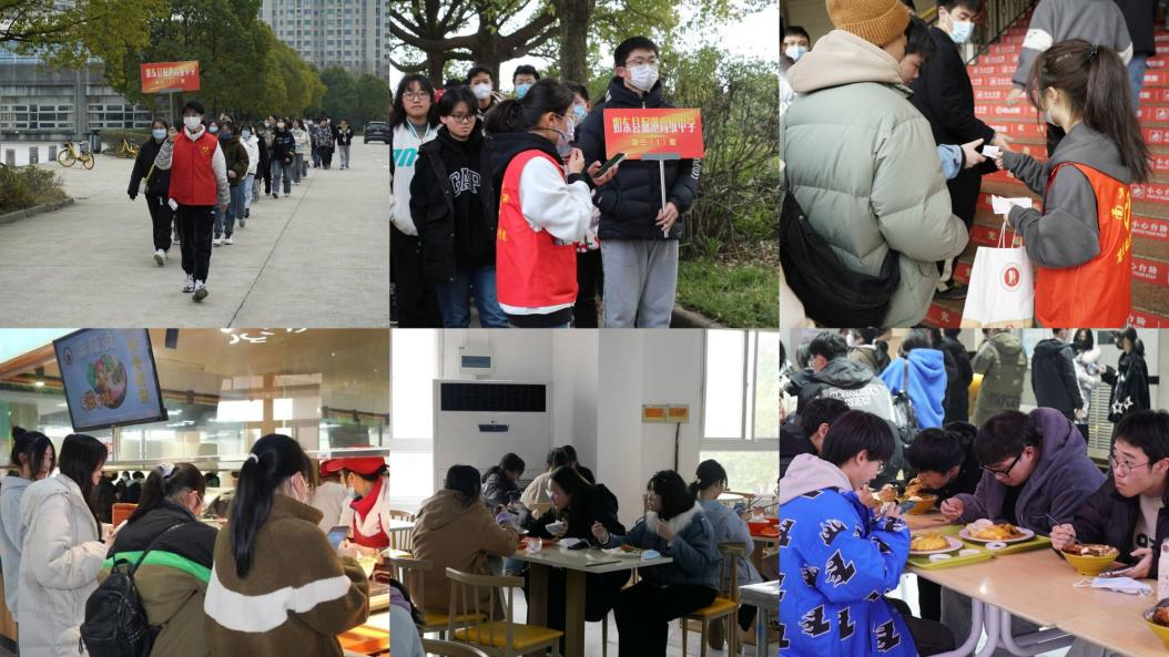 的志愿者引导同学们有序进入西苑食堂就餐。琳琅满目的美食,酸甜香辣各种味道与舌尖相逢,缓解了同学们路途上的疲劳。南财之行正式拉开帷幕。