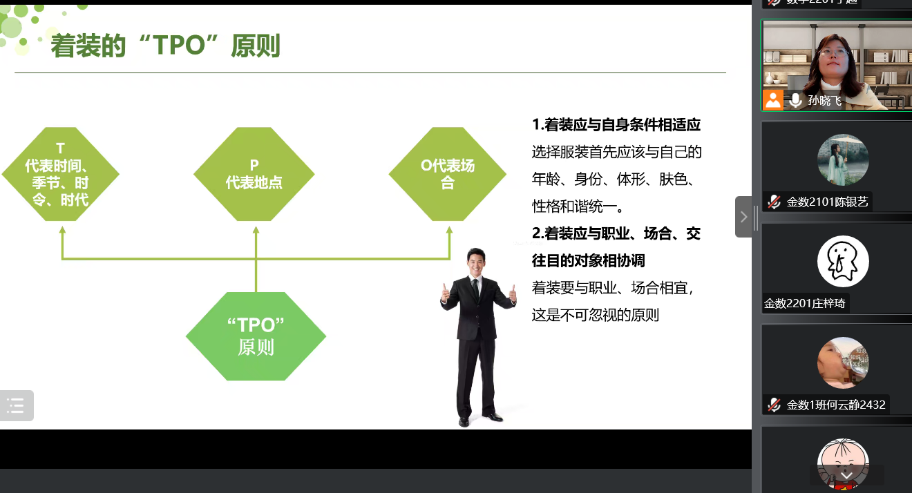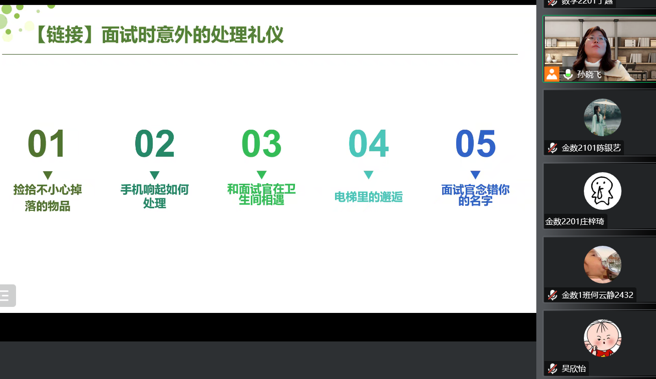 为了让同学们对职场礼仪有更多了解,11月8日晚,看球直播 在线上举办了以“知礼守礼,方能’职’远”为主题的讲座。讲座由看球直播 学工办主任、团委书记孙晓飞主讲,2021、2022级全体学生共同参与。