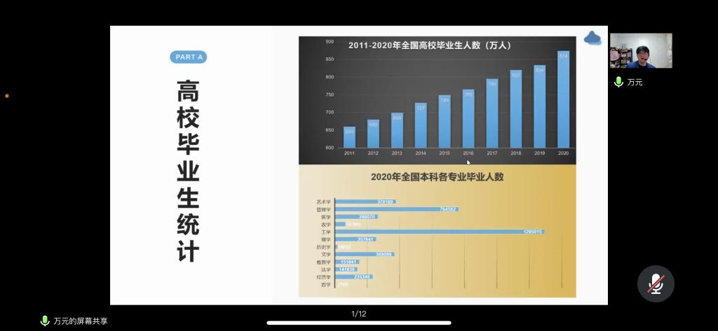 “2019年是过去十年最坏的一年,但也是未来十年最好的一年”,万老师用这样一句话简单概括了2019年的疫情突发和后十年的经济发展状况。万老师首先以疫情下的上海经济状况为引,娓娓道出当今毕业生的就业形势,再从高校毕业生人数和考研人数逐年增加的现象总结出大学生毕业后竞争日趋激烈的结果。紧接着,万老师从金融数学专业学习内容,就业前景和就业薪酬等不同方面层层剖析,他指出,数学知识是金融知识理论体系的根基,学习数学知识能锻炼同学们的逻辑思维能力,有利于同学们未来在工作岗位上的发挥。万老师细致的讲解让同学们对所学专业有了更加深刻的理解。最后,万老师殷切地说道,大学是你们所受约束最少的阶段,也是你们“试错”机会成本最小的阶段,希望你们能够在这个阶段努力发掘自我,学好专业知识。