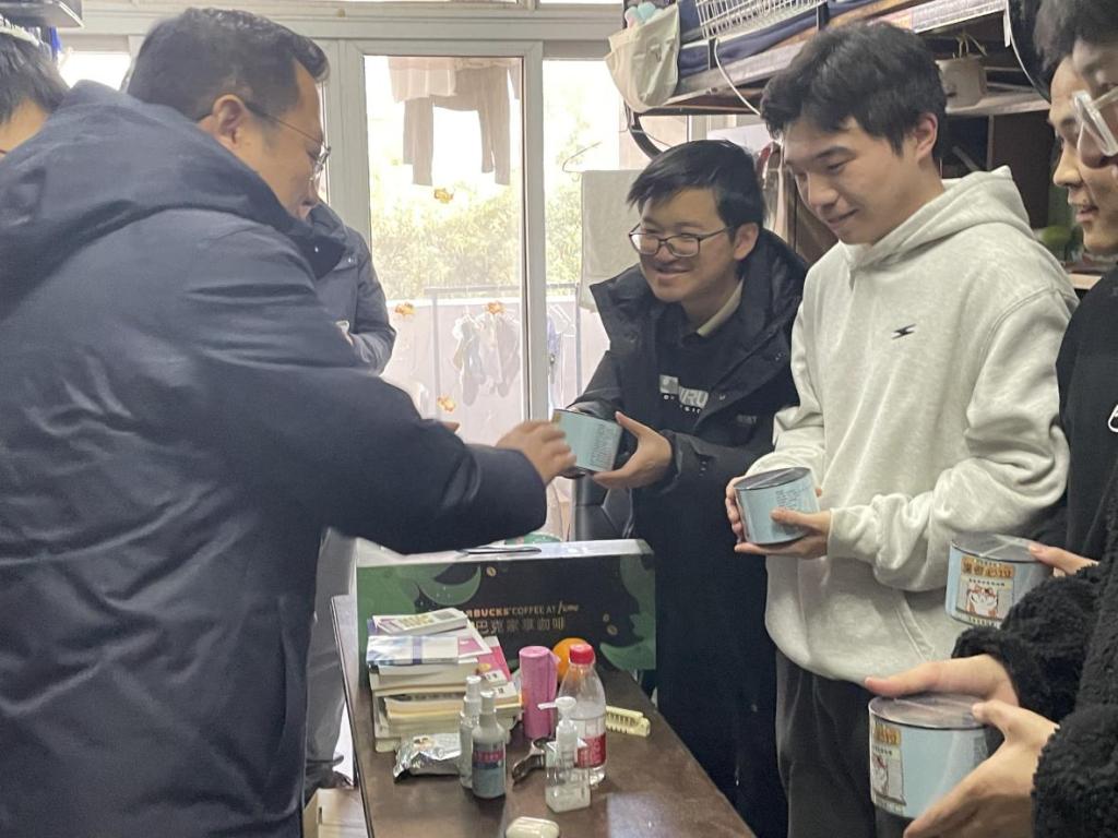 赵国栋副校长与考研学生亲切交流,询问学生的复习备考、生活保障等情况。他代表学校向考研学子们表达了最真挚的祝福,对同学们为梦想拼搏的精神给予了充分肯定。他叮嘱同学们要注意劳逸结合,保持平和的心态,以昂扬的斗志和饱满的精神状态迎接考试。赵国栋副校长将橙子、文创产品、文具等慰问品送到考研学子手中。一个个金黄的橙子寓意着心想事“橙”;文创产品预祝同学们旗开得胜;文具代表着金榜题名,饱含着学校对考研学子的美好祝愿。