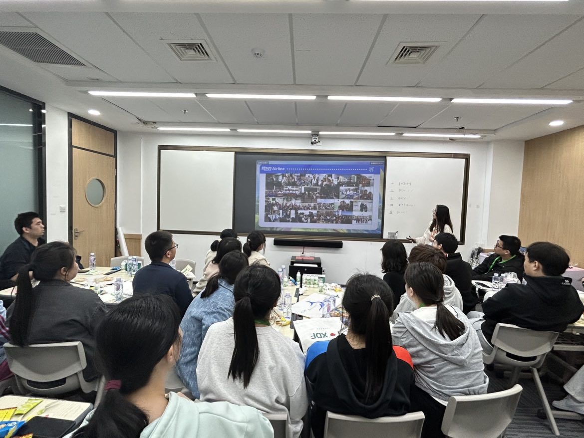 唐杰总监致欢迎辞,对南财师生的到来表示热烈欢迎,介绍了新东方行业发展概况、企业组织文化、人才培养机制及业务发展板块,详细分析了新东方江苏省域的情况,并展示了南财学生在新东方江苏省域的入职情况。
