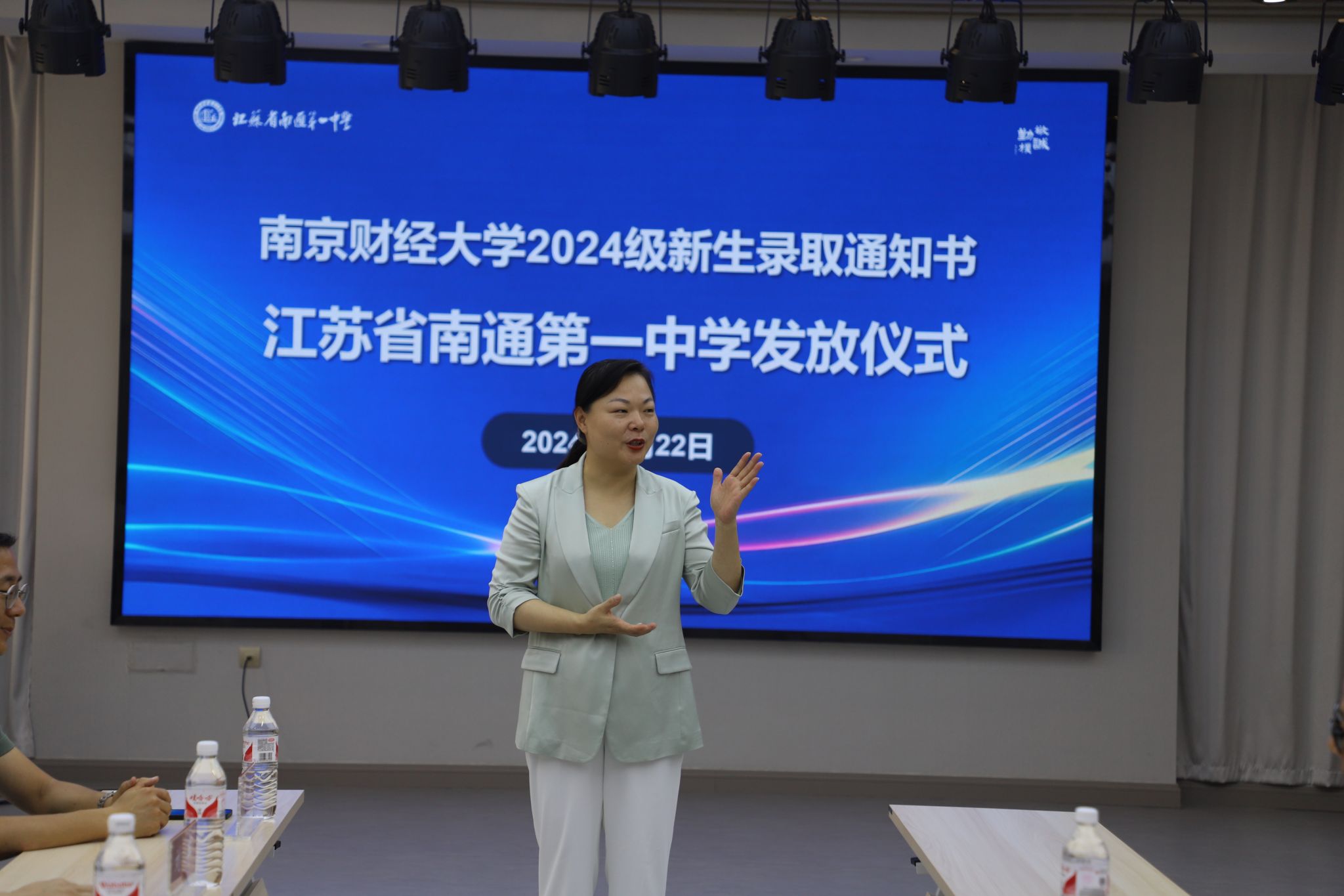 李煜副校长讲话。她首先向20名圆梦南财大的南通一中学子表示热烈祝贺和诚挚欢迎,高度赞扬了南通一中的办学质量,期待双方以“优秀生源基地”建设为载体,全方位加强沟通、交流与合作,为南财大输送更多优质生源。接着,她向大家介绍了南财大的历史变迁和现今成绩,相信同学们定能如这盛夏骄阳,能量满载,在硕果累累的季节再度出发,砥砺前行,在南财大成就新的辉煌,成长为南财大和南通一中共同的优秀校友。