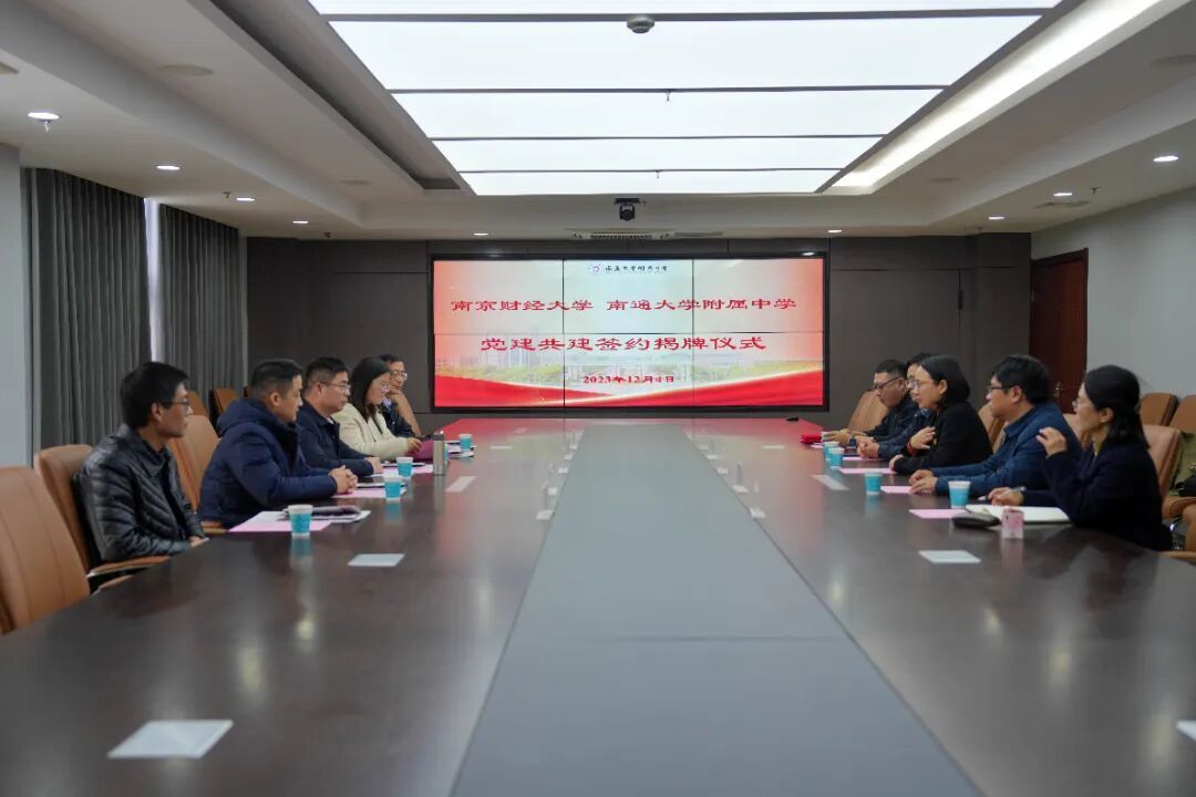 与南通大学附属中学党委在南通大学附属中学博约楼319会议室举行党建共建签约仪式。副院长(主持工作)方国昌一行5人,南通大学附属中学校长、党委副书记范永梅、党委副书记、纪委书记沈健、党委委员、副校长,第二党支部第一书记朱振华、党政办公室主任沈涛、团委书记韩慧贤、学生处副主任、第二党支部书记汪淳朴参加了此次签约仪式。方国昌副院长(主持工作)对南通大学附属中学建校10年来取得的成绩表示祝贺,并介绍了我校发展近况以及足球比赛直播