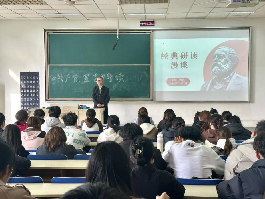 在仙林校区德业楼116教室举办经典研读漫谈活动。校“五老”讲师团成员、胡连生教授受邀作“《共产党宣言》导读”专题讲座,足球比赛直播